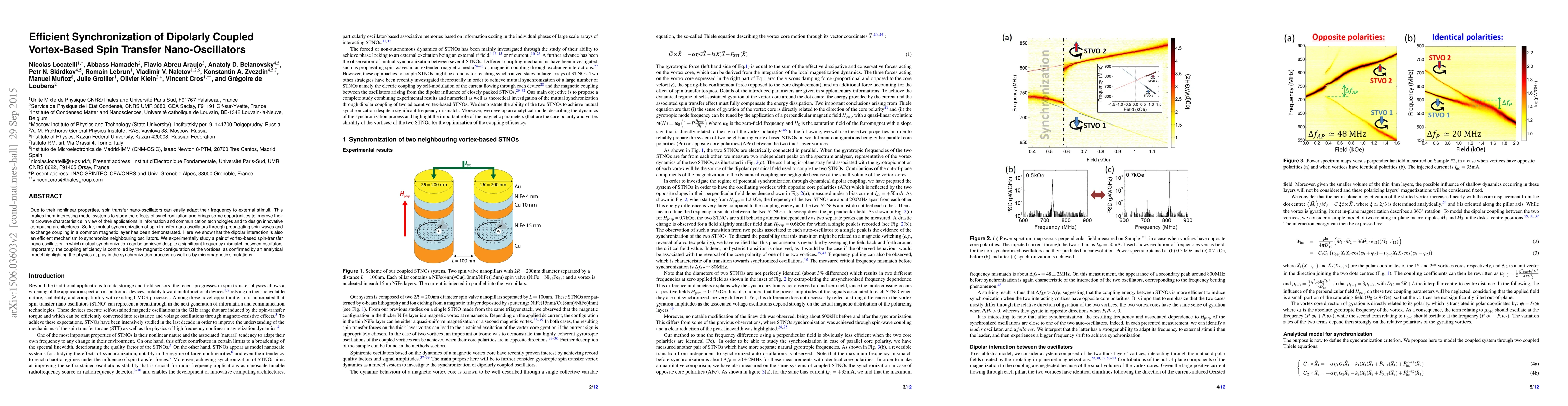 The paper presents an analytical model and micromagnetic simulations to understand and predict the synchronization of dipolarly coupled vortex-based spin-transfer nano-oscillators, highlighting the role of vortex core polarities.
