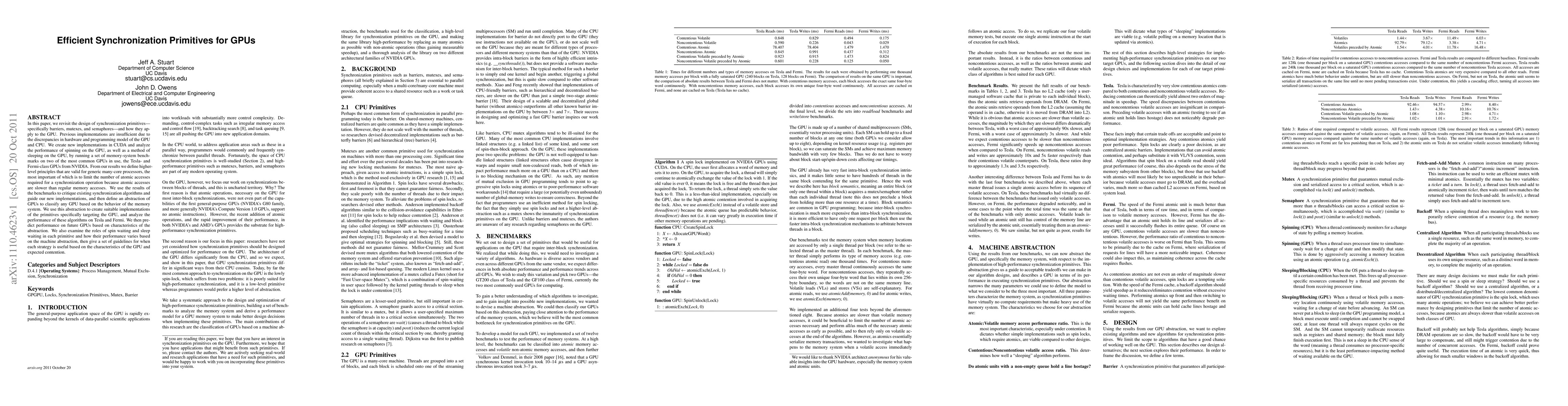 In this paper, we revisit the design of synchronization primitives---specifically barriers, mutexes, and semaphores---and how they apply to the GPU. Previous implementations are insufficient due to the discrepancies in hardware and programming model of the GPU and CPU. We create new implementations in CUDA and analyze the performance of spinning on the GPU, as well as a method of sleeping on the GPU, by running a set of memory-system benchmarks on two of the most common GPUs in use, the Tesla- and Fermi-class GPUs from NVIDIA. From our results we define higher-level principles that are valid for generic many-core processors, the most important of which is to limit the number of atomic accesses required for a synchronization operation because atomic accesses are slower than regular memory accesses. We use the results of the benchmarks to critique existing synchronization algorithms and guide our new implementations, and then define an abstraction of GPUs to classify any GPU based on the behavior of the memory system. We use this abstraction to create suitable implementations of the primitives specifically targeting the GPU, and analyze the performance of these algorithms on Tesla and Fermi. We then predict performance on future GPUs based on characteristics of the abstraction. We also examine the roles of spin waiting and sleep waiting in each primitive and how their performance varies based on the machine abstraction, then give a set of guidelines for when each strategy is useful based on the characteristics of the GPU and expected contention.