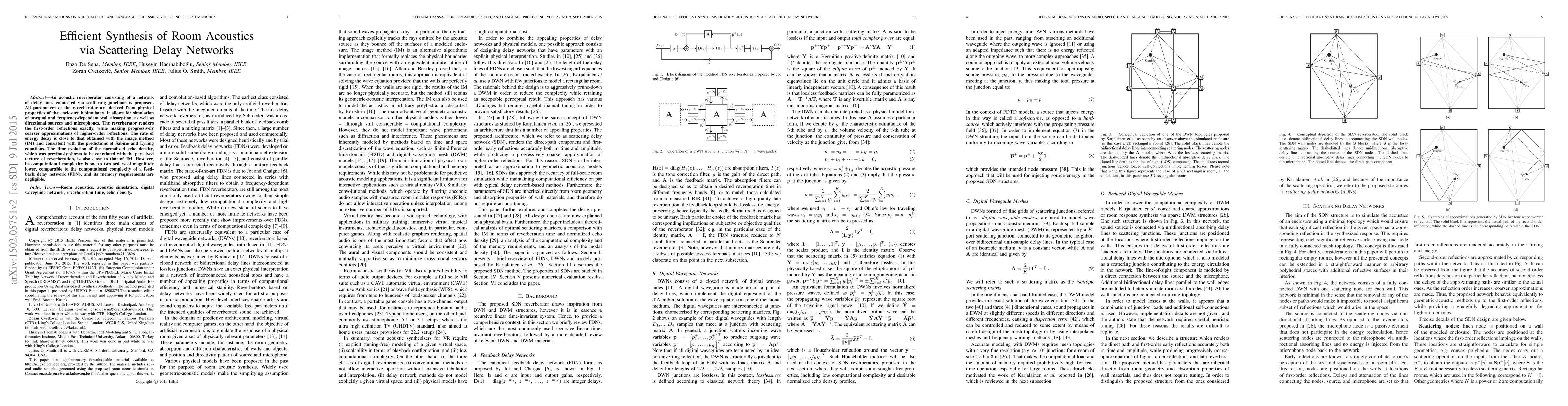 This paper proposes an efficient reverberator using scattering delay networks to simulate room acoustics, achieving lower computational complexity and negligible memory requirements compared to traditional methods while maintaining accurate reverberation characteristics. The method accurately simulates frequency-dependent absorption and directional sources, rendering first-order reflections precisely and higher-order reflections with progressively coarser approximations.
