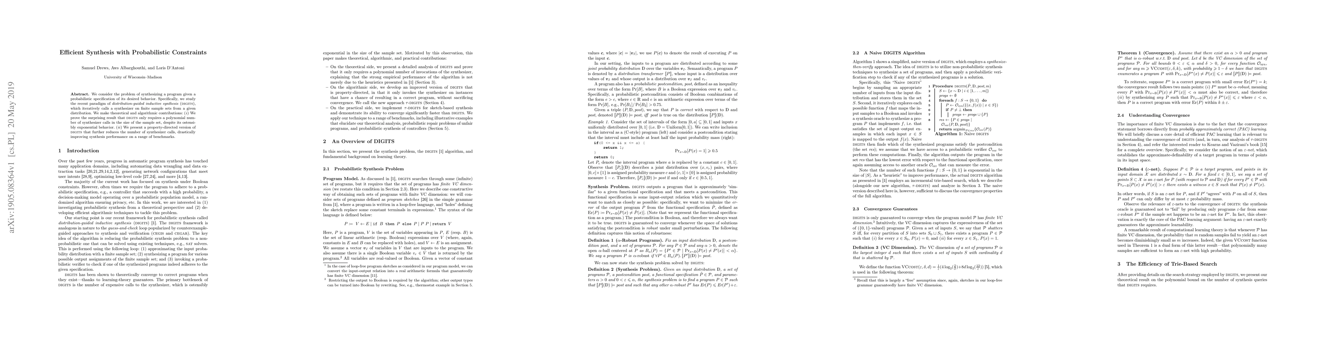 This paper presents a new synthesis paradigm called DIGITS that efficiently synthesizes programs given probabilistic specifications, reducing the number of synthesizer calls by up to 90% through property-directed optimization.