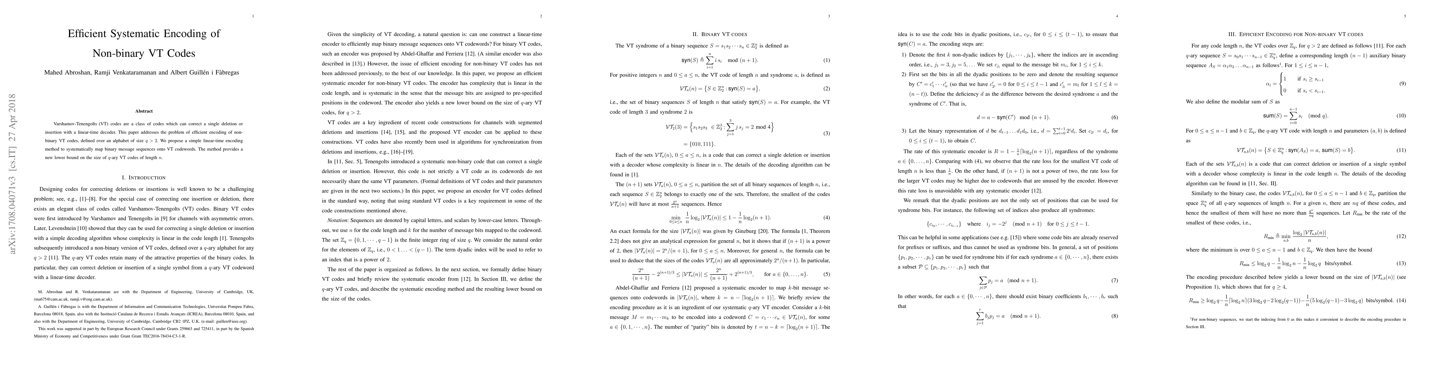 This paper proposes a linear-time encoding method for non-binary Varshamov-Tenengolts (VT) codes, enabling efficient systematic encoding of message sequences onto VT codewords. The method also establishes a new lower bound on the size of $q$-ary VT codes of length $n$.