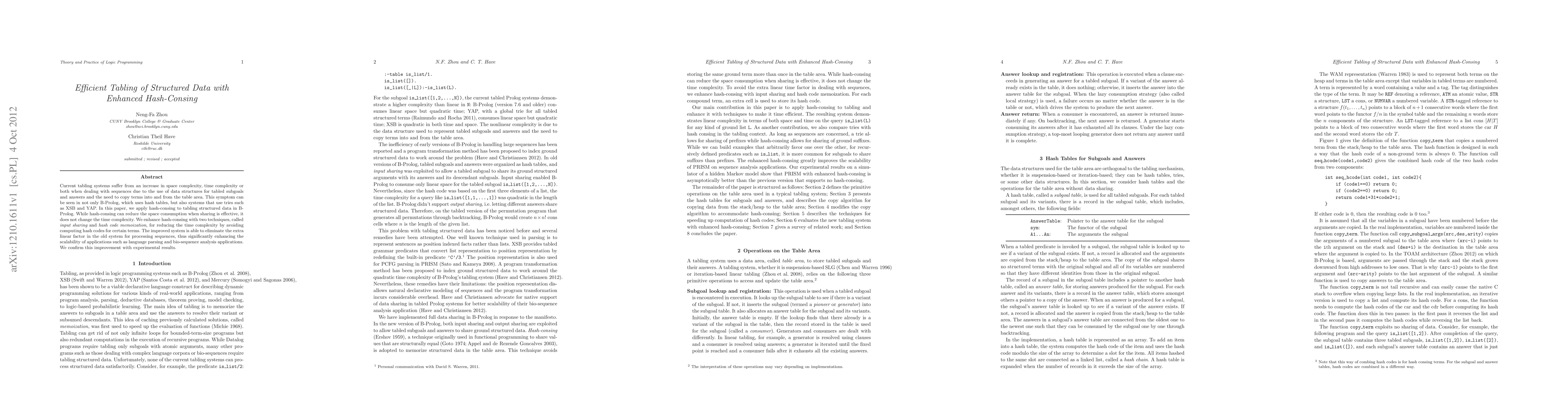 Current tabling systems suffer from an increase in space complexity, time complexity or both when dealing with sequences due to the use of data structures for tabled subgoals and answers and the need to copy terms into and from the table area. This symptom can be seen in not only B-Prolog, which uses hash tables, but also systems that use tries such as XSB and YAP. In this paper, we apply hash-consing to tabling structured data in B-Prolog. While hash-consing can reduce the space consumption when sharing is effective, it does not change the time complexity. We enhance hash-consing with two techniques, called input sharing and hash code memoization, for reducing the time complexity by avoiding computing hash codes for certain terms. The improved system is able to eliminate the extra linear factor in the old system for processing sequences, thus significantly enhancing the scalability of applications such as language parsing and bio-sequence analysis applications. We confirm this improvement with experimental results.