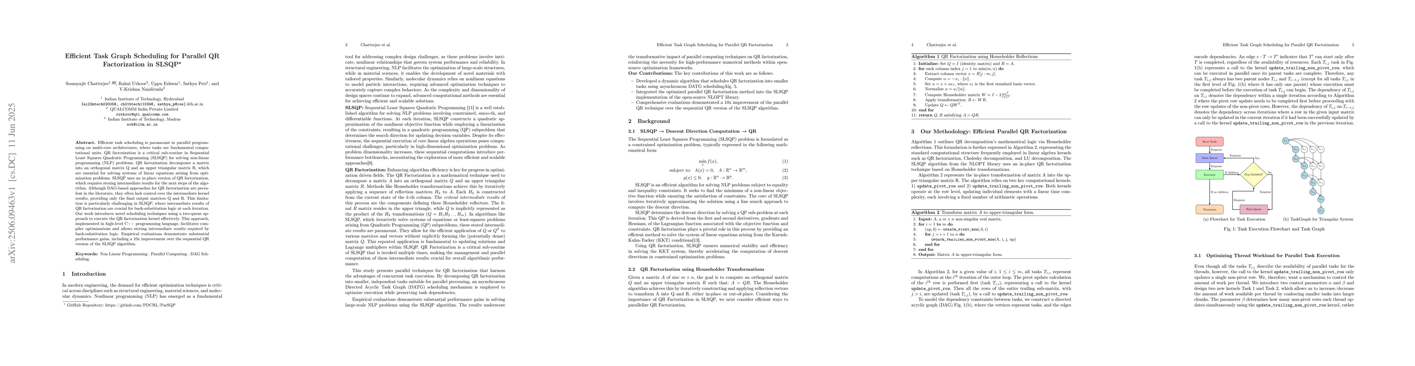 This paper introduces a novel scheduling technique for parallel QR factorization in SLSQP, achieving a 10x performance gain over the sequential version, by effectively managing intermediate results.