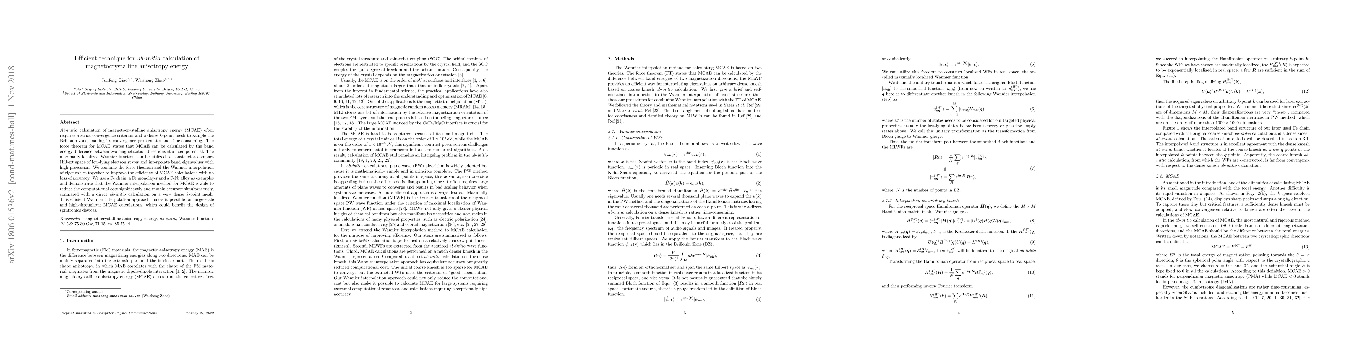 This paper proposes an efficient method combining the force theorem and Wannier interpolation for ab-initio calculations of magnetocrystalline anisotropy energy (MCAE), significantly reducing computational costs while maintaining accuracy, demonstrated through Fe chain, Fe monolayer, and FeNi alloy examples. The approach enables large-scale MCAE calculations, aiding the design of spintronics devices.
