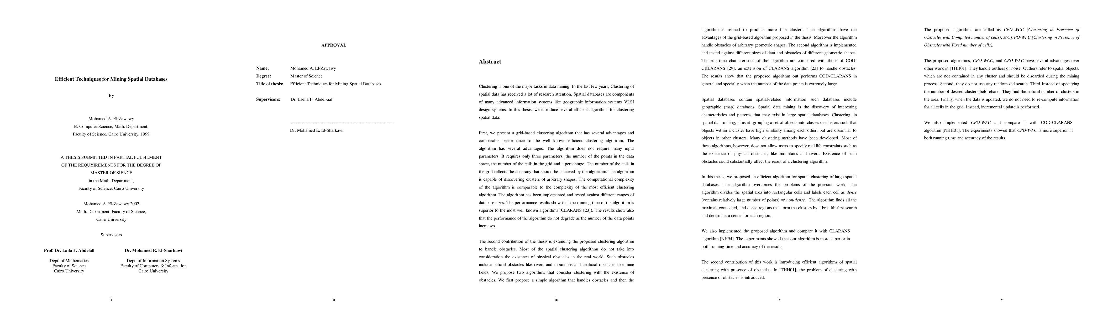 Clustering is one of the major tasks in data mining. In the last few years, Clustering of spatial data has received a lot of research attention. Spatial databases are components of many advanced information systems like geographic information systems VLSI design systems. In this thesis, we introduce several efficient algorithms for clustering spatial data. First, we present a grid-based clustering algorithm that has several advantages and comparable performance to the well known efficient clustering algorithm. The algorithm has several advantages. The algorithm does not require many input parameters. It requires only three parameters, the number of the points in the data space, the number of the cells in the grid and a percentage. The number of the cells in the grid reflects the accuracy that should be achieved by the algorithm. The algorithm is capable of discovering clusters of arbitrary shapes. The computational complexity of the algorithm is comparable to the complexity of the most efficient clustering algorithm. The algorithm has been implemented and tested against different ranges of database sizes. The performance results show that the running time of the algorithm is superior to the most well known algorithms (CLARANS [23]). The results show also that the performance of the algorithm do not degrade as the number of the data points increases.