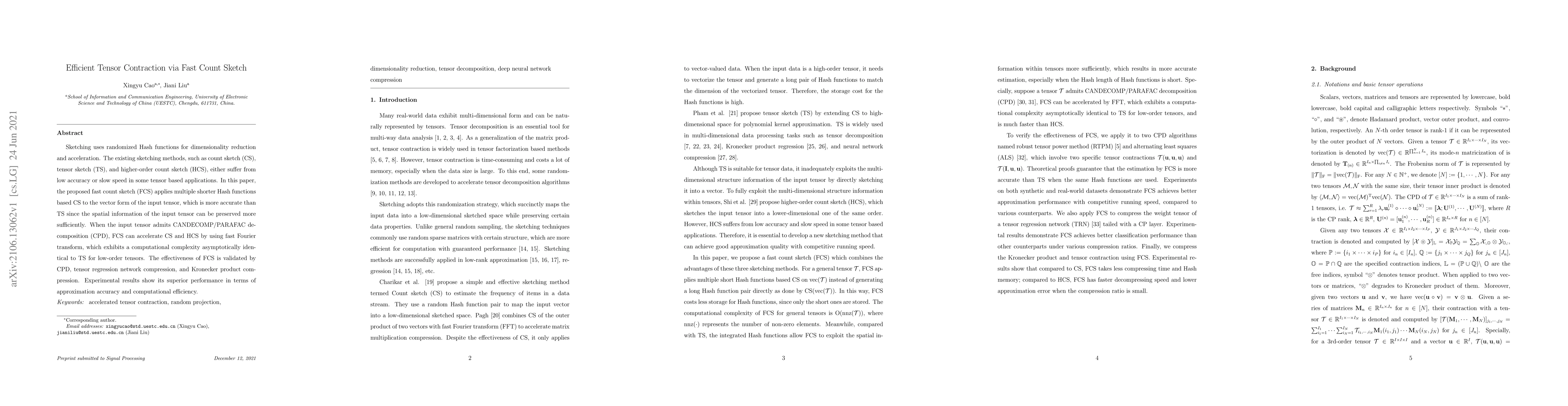 This paper proposes fast count sketch (FCS) for efficient tensor contraction, utilizing multiple shorter Hash functions to improve accuracy over tensor sketch methods. FCS leverages fast Fourier transform for tensors with CANDECOMP/PARAFAC decomposition, achieving comparable computational complexity while maintaining higher accuracy, validated through tensor regression and product compression.
