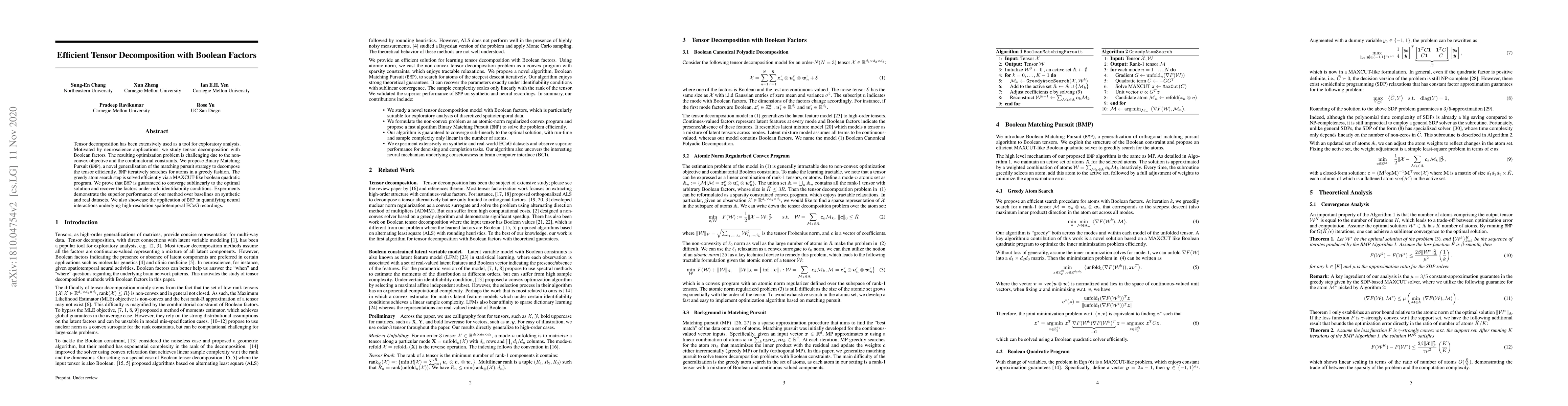 This paper proposes Binary Matching Pursuit (BMP) for efficient tensor decomposition with Boolean factors, addressing the non-convex optimization and combinatorial constraints. BMP converges sublinearly and outperforms baselines, demonstrating its effectiveness in analyzing neural interactions from high-resolution ECoG recordings.