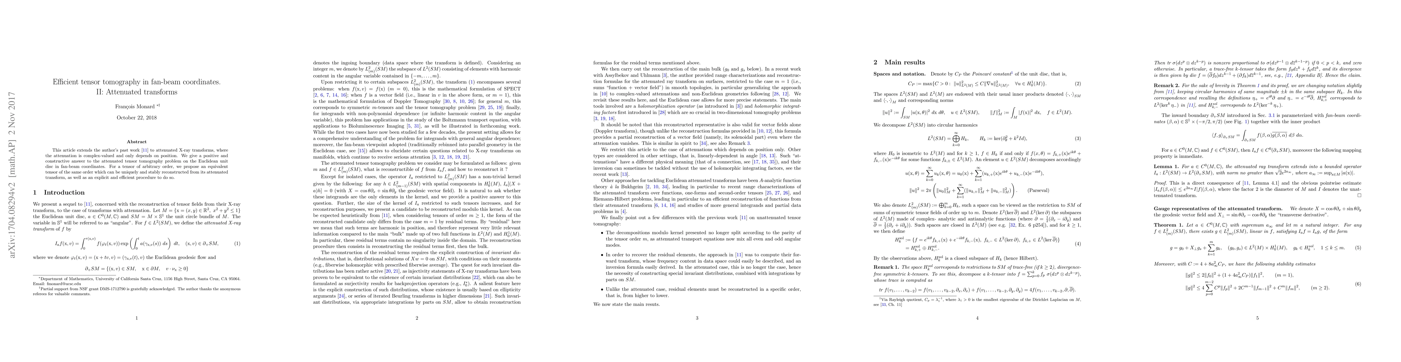 This article extends the author's past work [Inv. Probl. Imaging, 10:2 (2016), 433--459] to attenuated X-ray transforms, where the attenuation is complex-valued and only depends on position. We give a positive and constructive answer to the attenuated tensor tomography problem on the Euclidean unit disc in fan-beam coordinates. For a tensor of arbitrary order, we propose an equivalent tensor of the same order which can be uniquely and stably reconstructed from its attenuated transform, as well as an explicit and efficient procedure to do so.