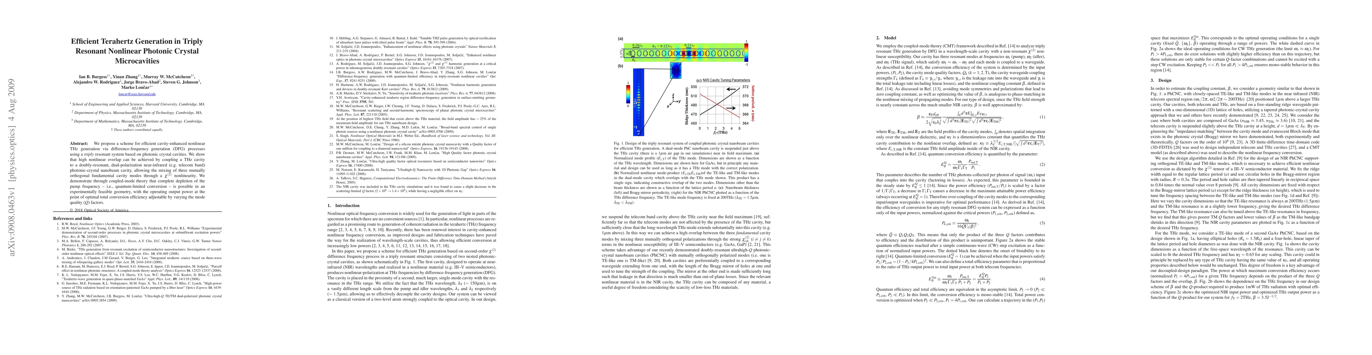 The research employs coupled-mode theory (CMT) to analyze terahertz (THz) generation by difference-frequency generation (DFG) in triply resonant photonic crystal microcavities. It demonstrates the feasibility of achieving high nonlinear overlap through a chi(2) nonlinearity by coupling a THz cavity to a doubly-resonant, dual-polarization near-infrared (NIR) photonic-crystal nanobeam cavity.