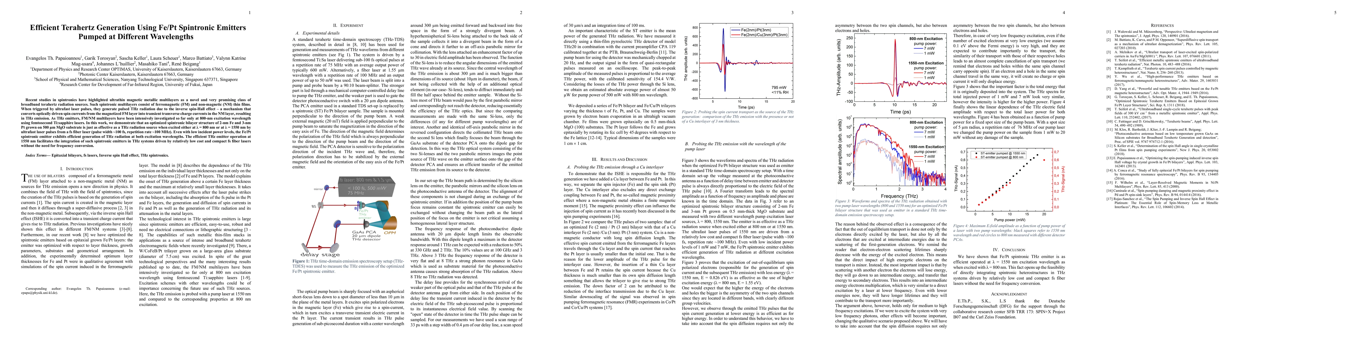 The paper presents an optimized Fe/Pt spintronic bilayer structure that efficiently generates terahertz radiation at both 800 nm and 1550 nm excitation wavelengths, facilitating integration with low-cost fiber lasers.