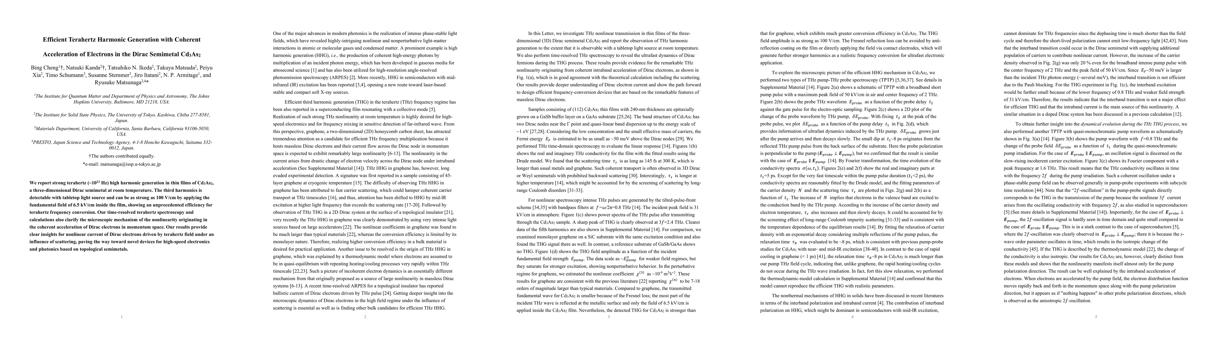 This paper reports efficient terahertz harmonic generation in Cd3As2, a Dirac semimetal, driven by coherent acceleration of its electrons, achieving unprecedented efficiency for terahertz frequency conversion. The study provides insights into the nonlinear current mechanisms of Dirac electrons, paving the way for advanced electronic and photonic devices.