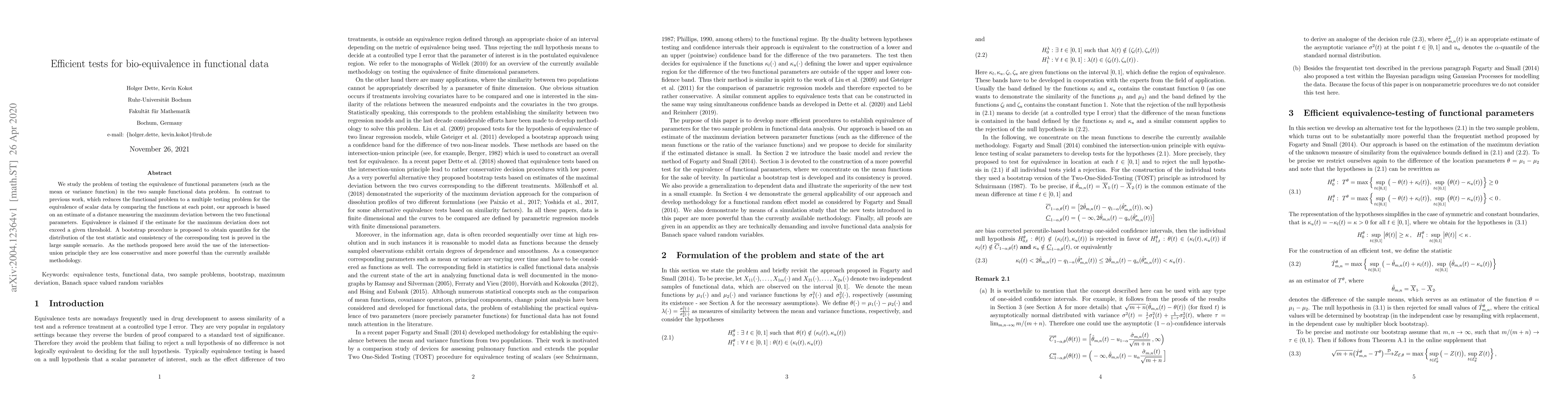 This research introduces a new method for testing bio-equivalence in functional data, using a distance estimate to compare functional parameters. The approach is less conservative and more powerful than previous methods, with a bootstrap procedure for obtaining quantiles and proven consistency in large samples.