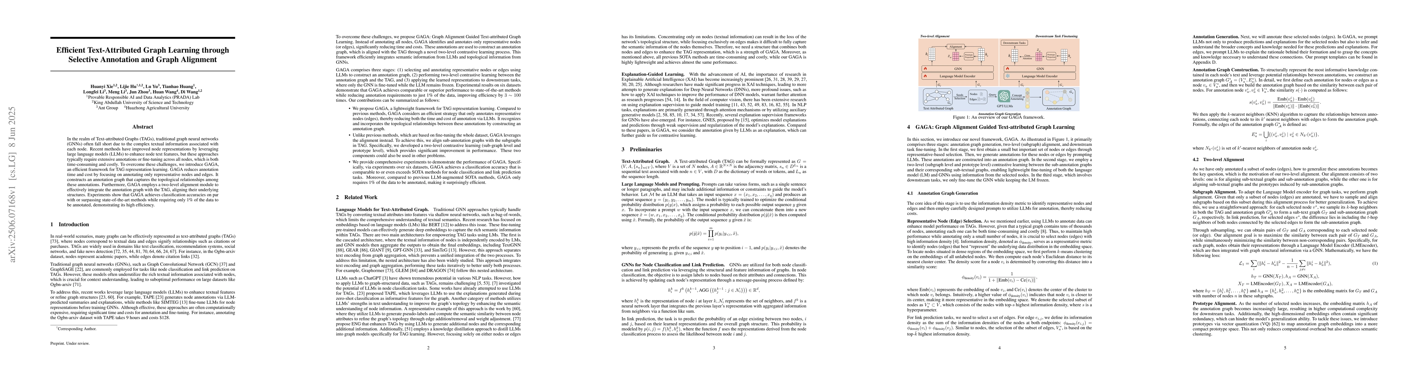 GAGA, an efficient framework for Text-attributed Graphs, reduces annotation time and cost by focusing on representative nodes and edges, achieving comparable classification accuracies with only 1% of the data annotated.