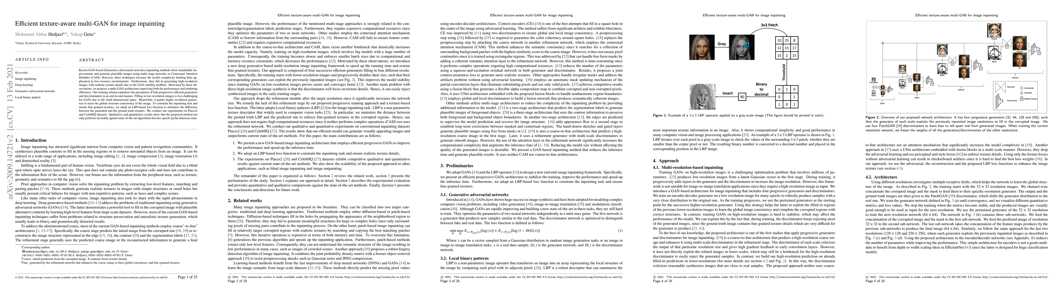The paper proposes an efficient texture-aware multi-GAN architecture for image inpainting that optimizes four progressive generators and discriminators to improve both performance and efficiency. The method uses LBP-based loss to ensure realistic texture details and demonstrates superior results in both speed and quality compared to state-of-the-art methods on Places2 and CelebHQ datasets.