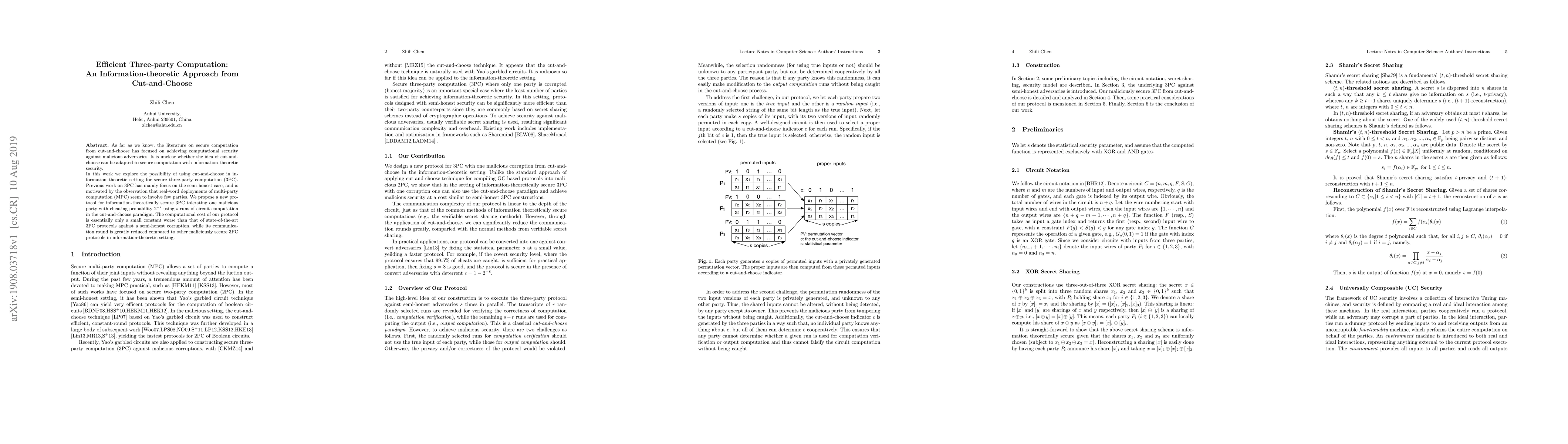 This paper proposes an information-theoretic secure three-party computation (3PC) protocol using the cut-and-choose approach, tolerating one malicious party with a low cheating probability. It achieves significantly reduced communication rounds compared to existing maliciously secure 3PC protocols, while maintaining competitive computational costs.
