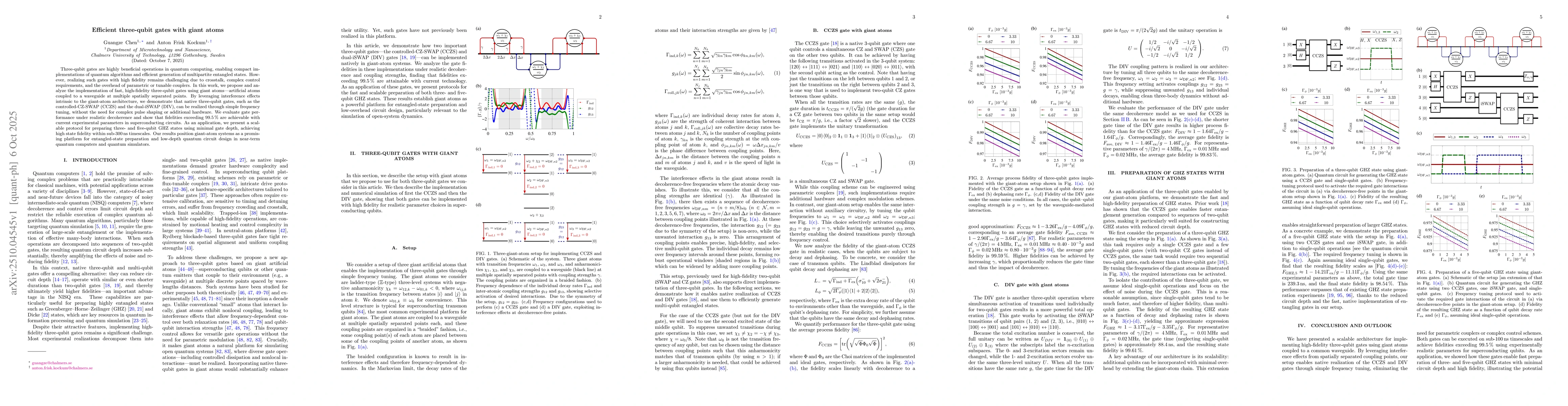 Three-qubit gates are highly beneficial operations in quantum computing, enabling compact implementations of quantum algorithms and efficient generation of multipartite entangled states. However, realizing such gates with high fidelity remains challenging due to crosstalk, complex control requirements, and the overhead of parametric or tunable couplers. In this work, we propose and analyze the implementation of fast, high-fidelity three-qubit gates using giant atoms--artificial atoms coupled to a waveguide at multiple spatially separated points. By leveraging interference effects intrinsic to the giant-atom architecture, we demonstrate that native three-qubit gates, such as the controlled-CZ-SWAP (CCZS) and the dual-iSWAP (DIV), can be realized through simple frequency tuning, without the need for complex pulse shaping or additional hardware. We evaluate gate performance under realistic decoherence and show that fidelities exceeding 99.5% are achievable with current experimental parameters in superconducting circuits. As an application, we present a scalable protocol for preparing three- and five-qubit GHZ states using minimal gate depth, achieving high state fidelity within sub-300ns timescales. Our results position giant-atom systems as a promising platform for entangled-state preparation and low-depth quantum circuit design in near-term quantum computers and quantum simulators.