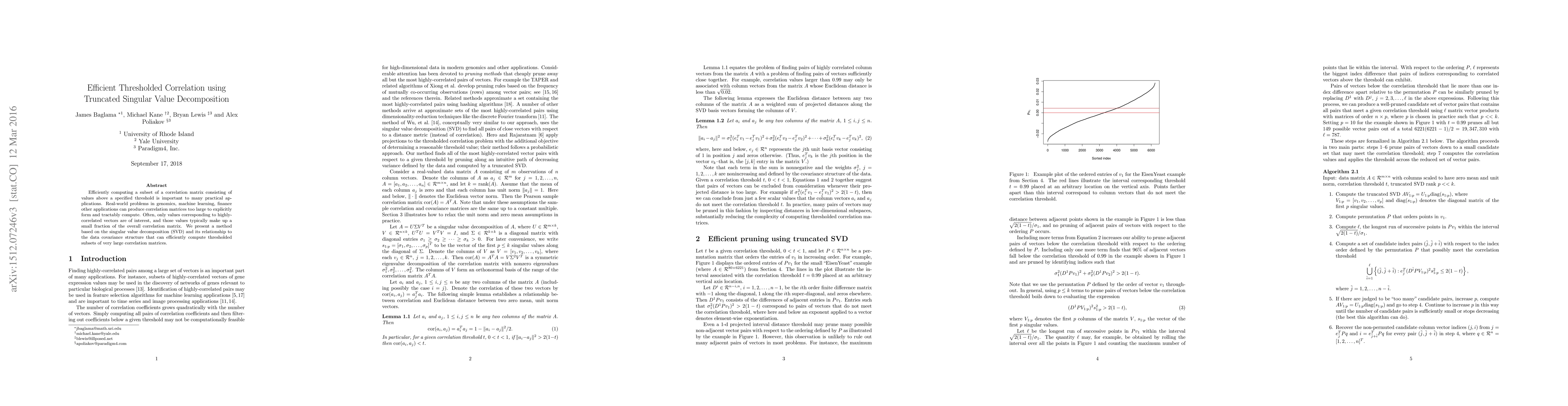 This paper proposes a method using truncated singular value decomposition (SVD) to efficiently compute thresholded subsets of large correlation matrices, focusing on highly-correlated values that constitute a small fraction of the overall matrix, applicable in genomics, machine learning, and finance.