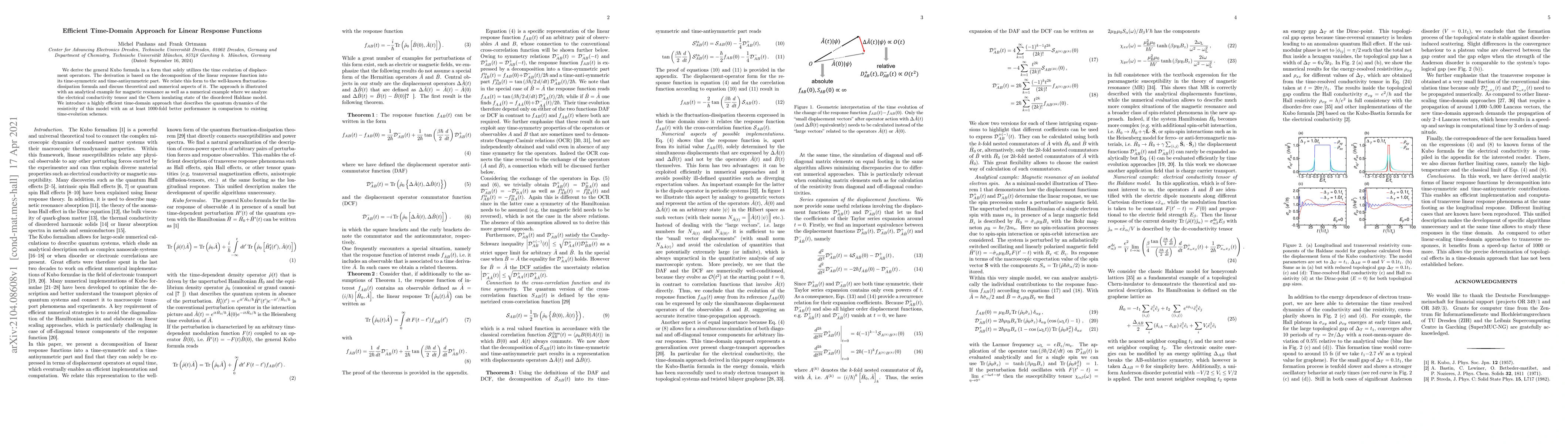 We derive the general Kubo formula in a form that solely utilizes the time evolution of displacement operators. The derivation is based on the decomposition of the linear response function into its time symmetric and time anti-symmetric part. We relate this form to the well-known fluctuation-dissipation formula and discuss theoretical and numerical aspects of it. The approach is illustrated with an analytical example for magnetic resonance as well as a numerical example where we analyze the electrical conductivity tensor and the Chern insulating state of the disordered Haldane model. We introduce a highly efficient time-domain approach that describes the quantum dynamics of the resistivity of this model with an at least 1000-fold better performance in comparison to existing time-evolution schemes.