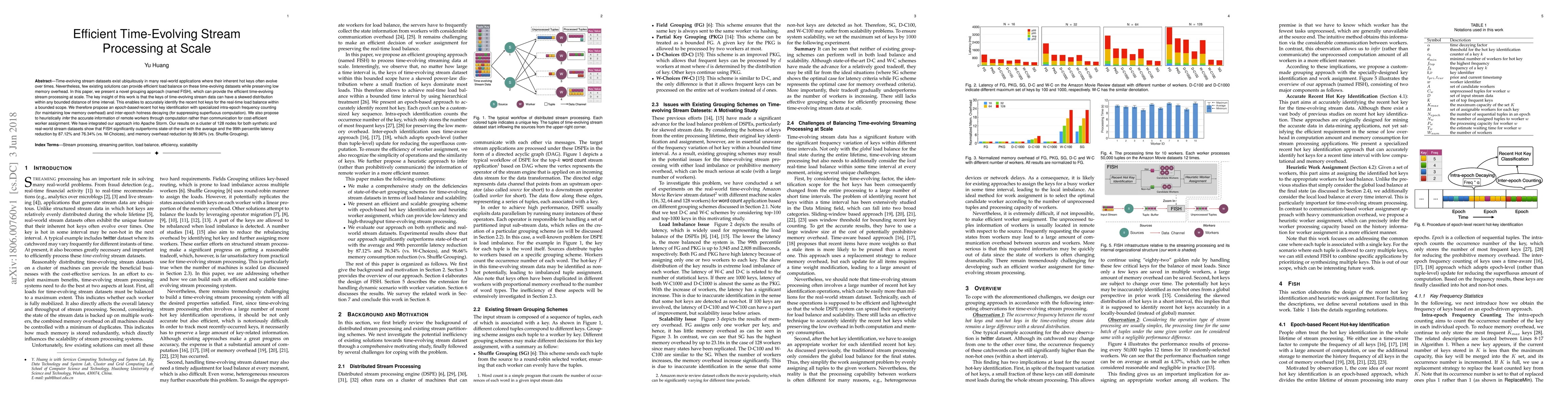 This paper introduces FISH, a novel grouping approach for efficient time-evolving stream processing at scale, which identifies recent hot keys to balance load and minimize memory overhead. FISH achieves significant performance and memory efficiency improvements over existing methods, as demonstrated by substantial latency and memory reductions in experiments on a 128-node cluster.
