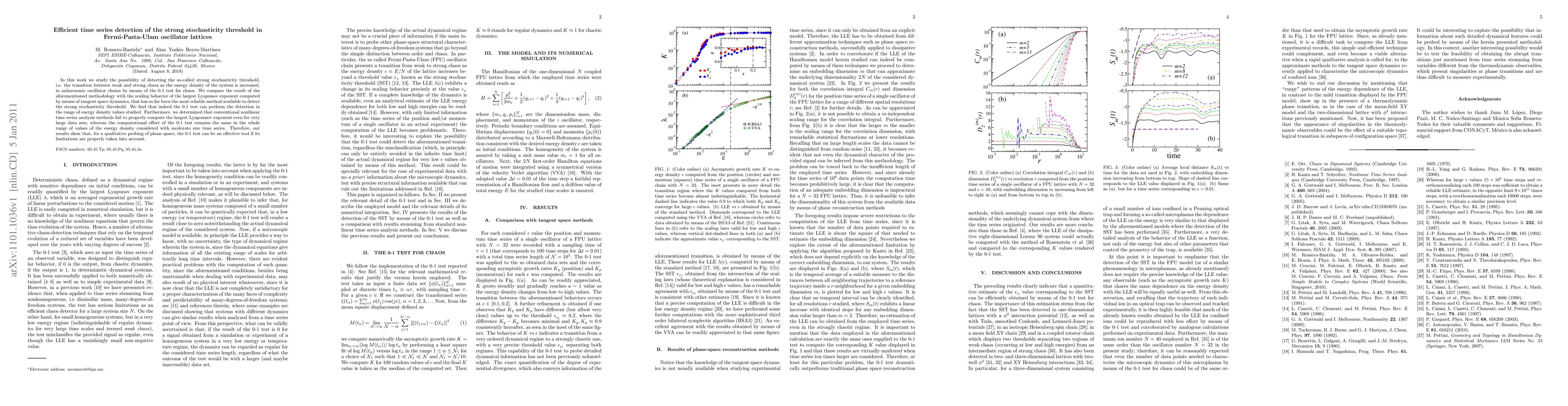 Researchers found that a 0-1 test method can detect the strong stochasticity threshold in Fermi-Pasta-Ulam oscillator lattices, outperforming conventional nonlinear time series analysis methods.