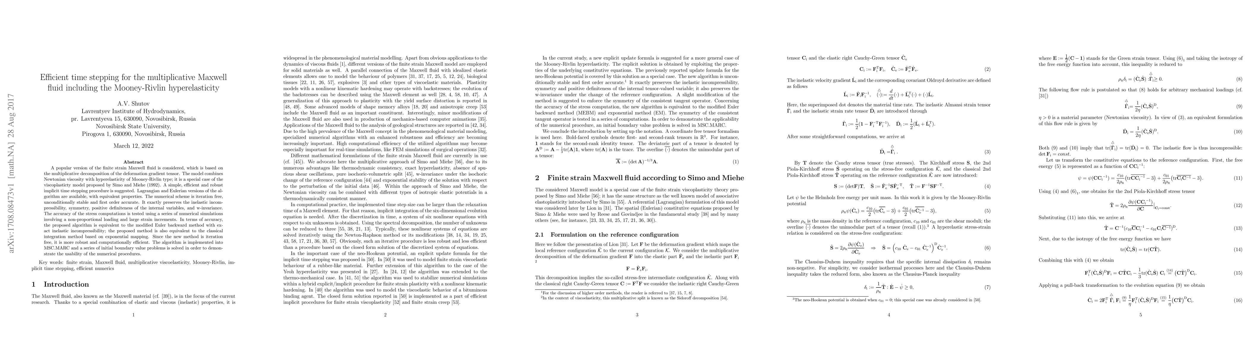 A popular version of the finite strain Maxwell fluid is considered, which is based on the multiplicative decomposition of the deformation gradient tensor. The model combines Newtonian viscosity with hyperelasticity of Mooney-Rivlin type; it is a special case of the viscoplasticty model proposed by Simo and Miehe (1992). A simple, efficient and robust implicit time stepping procedure is suggested. Lagrangian and Eulerian versions of the algorithm are available, with equivalent properties. The numerical scheme is iteration free, unconditionally stable and first order accurate. It exactly preserves the inelastic incompressibility, symmetry, positive definiteness of the internal variables, and w-invariance. The accuracy of the stress computations is tested using a series of numerical simulations involving a non-proportional loading and large strain increments. In terms of accuracy, the proposed algorithm is equivalent to the modified Euler backward method with exact inelastic incompressibility; the proposed method is also equivalent to the classical integration method based on exponential mapping. Since the new method is iteration free, it is more robust and computationally efficient. The algorithm is implemented into MSC.MARC and a series of initial boundary value problems is solved in order to demonstrate the usability of the numerical procedures.