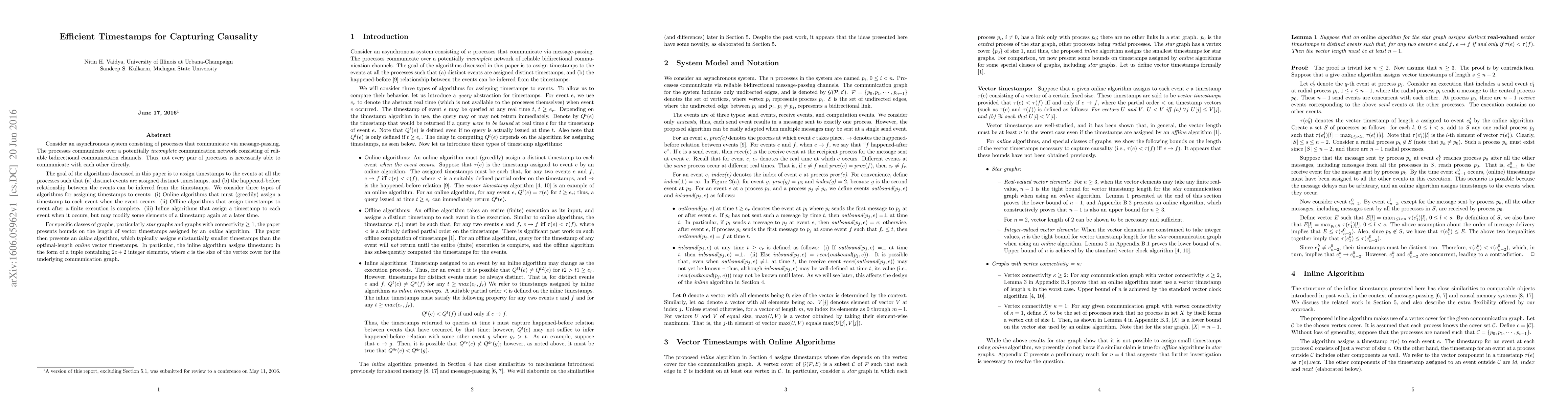 This paper proposes algorithms for assigning timestamps to events in asynchronous message-passing systems to capture causality. It introduces online, offline, and inline algorithms, with a focus on minimizing timestamp length, especially for star graphs and connected networks. An inline algorithm is presented that assigns smaller vector timestamps based on the vertex cover size of the communication graph.