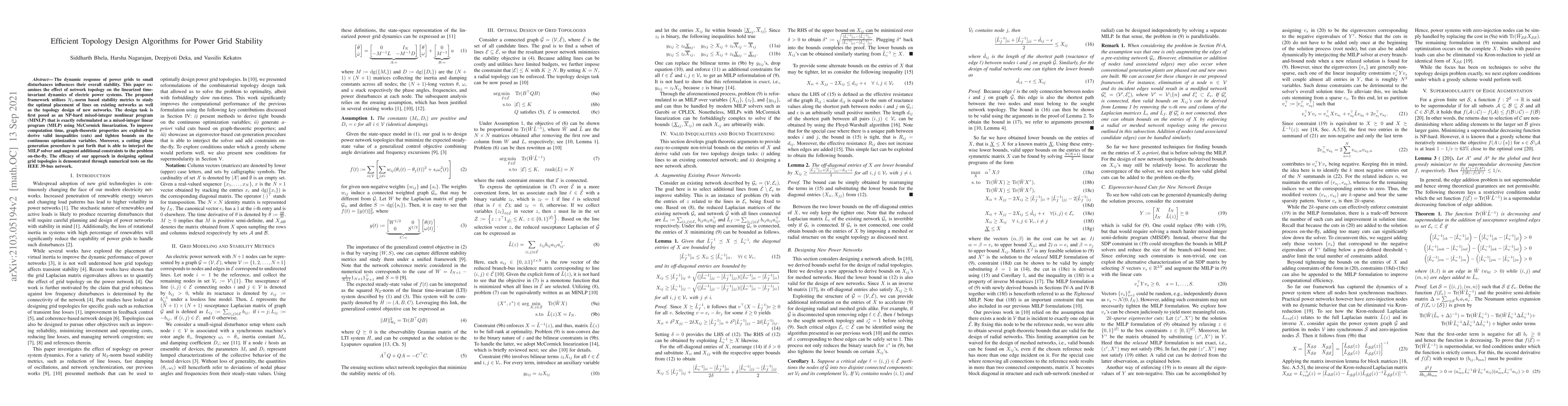 The dynamic response of power grids to small disturbances influences their overall stability. This paper examines the effect of network topology on the linearized time-invariant dynamics of electric power systems. The proposed framework utilizes ${\cal H}_2$-norm based stability metrics to study the optimal placement of lines on existing networks as well as the topology design of new networks. The design task is first posed as an NP-hard mixed-integer nonlinear program (MINLP) that is exactly reformulated as a mixed-integer linear program (MILP) using McCormick linearization. To improve computation time, graph-theoretic properties are exploited to derive valid inequalities (cuts) and tighten bounds on the continuous optimization variables. Moreover, a cutting plane generation procedure is put forth that is able to interject the MILP solver and augment additional constraints to the problem on-the-fly. The efficacy of our approach in designing optimal grid topologies is demonstrated through numerical tests on the IEEE 39-bus network.