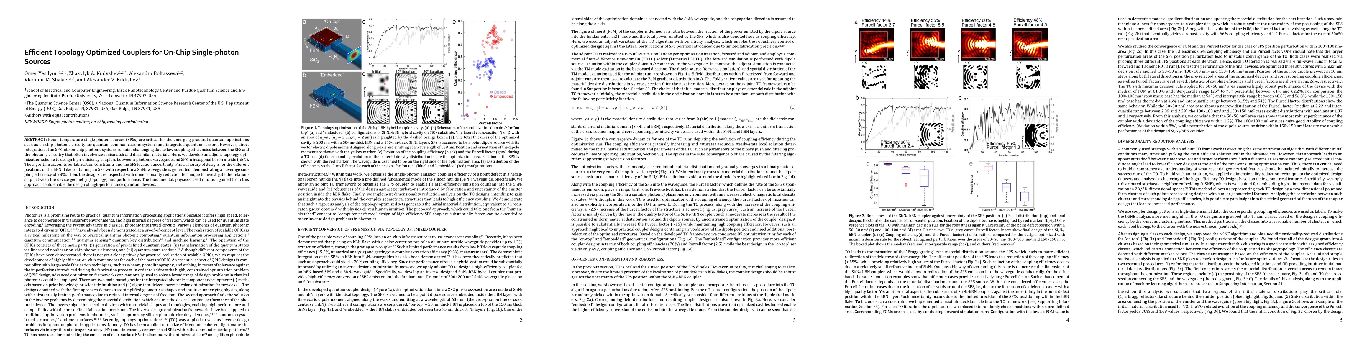 This research introduces an adjoint topology optimization scheme to design high-efficiency couplers between photonic waveguides and single-photon sources (SPSs) in hexagonal boron nitride (hBN). The method generates a library of designs with an average coupling efficiency of 78%, and utilizes dimensionality reduction to understand the relationship between device geometry and performance, aiming to improve integration of SPSs into on-chip photonic systems.