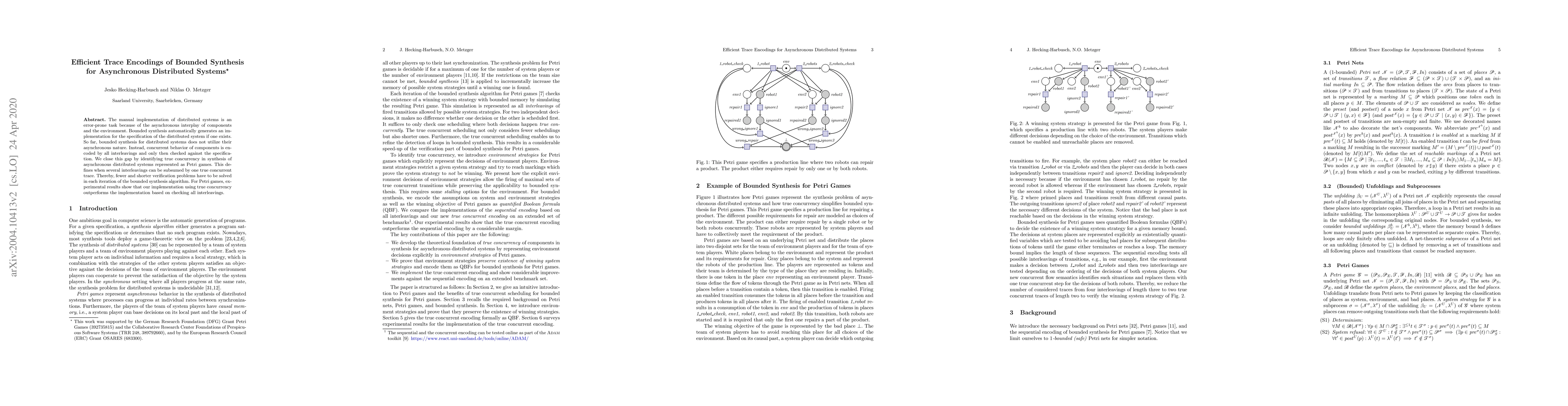 This paper proposes a method for efficient trace encoding in bounded synthesis for asynchronous distributed systems, focusing on identifying true concurrency to reduce the number of verification problems. Experimental results demonstrate that this approach outperforms traditional methods for Petri games.