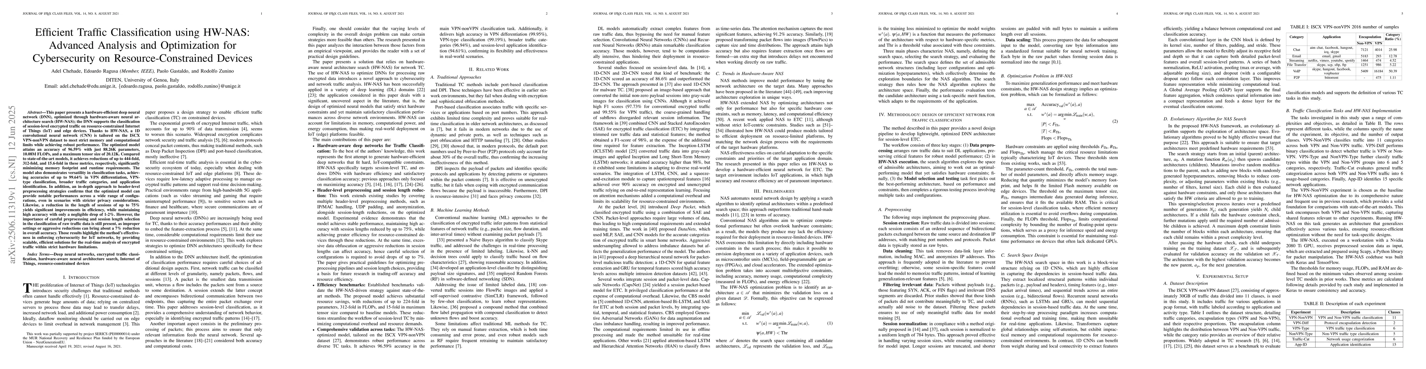 This paper presents a hardware-efficient deep neural network (DNN), optimized through hardware-aware neural architecture search (HW-NAS); the DNN supports the classification of session-level encrypted traffic on resource-constrained Internet of Things (IoT) and edge devices. Thanks to HW-NAS, a 1D convolutional neural network (CNN) is tailored on the ISCX VPN-nonVPN dataset to meet strict memory and computational limits while achieving robust performance. The optimized model attains an accuracy of 96.59% with just 88.26K parameters, 10.08M FLOPs, and a maximum tensor size of 20.12K. Compared to state-of-the-art models, it achieves reductions of up to 444-fold, 312-fold, and 15.6-fold in these metrics, respectively, significantly minimizing memory footprint and runtime requirements. The model also demonstrates versatility in classification tasks, achieving accuracies of up to 99.64% in VPN differentiation, VPN-type classification, broader traffic categories, and application identification. In addition, an in-depth approach to header-level preprocessing strategies confirms that the optimized model can provide notable performances across a wide range of configurations, even in scenarios with stricter privacy considerations. Likewise, a reduction in the length of sessions of up to 75% yields significant improvements in efficiency, while maintaining high accuracy with only a negligible drop of 1-2%. However, the importance of careful preprocessing and session length selection in the classification of raw traffic data is still present, as improper settings or aggressive reductions can bring about a 7% reduction in overall accuracy. Those results highlight the method's effectiveness in enforcing cybersecurity for IoT networks, by providing scalable, efficient solutions for the real-time analysis of encrypted traffic within strict hardware limitations.