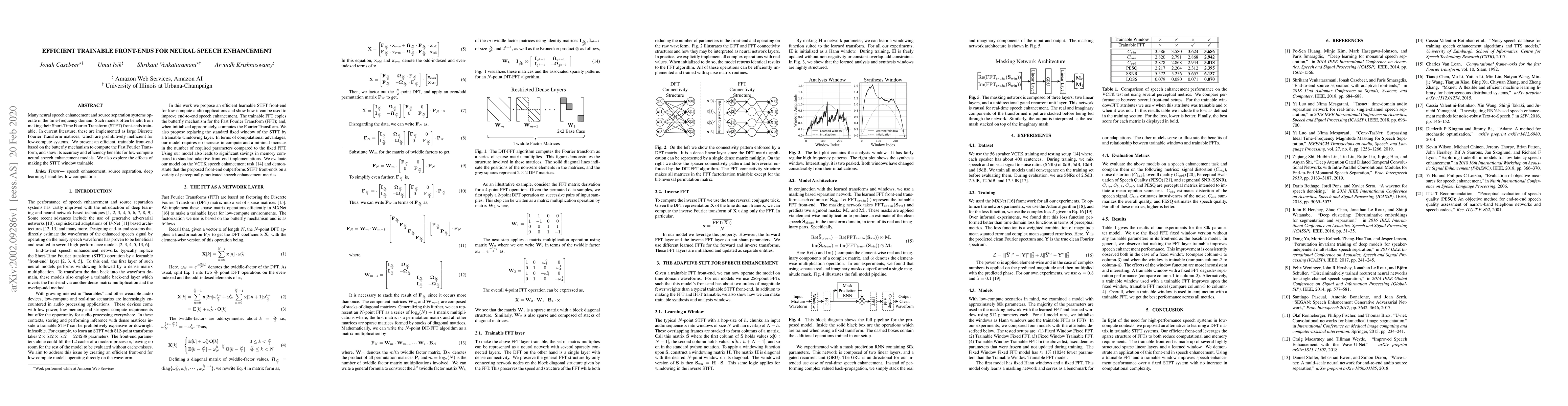 This paper proposes an efficient, trainable front-end for neural speech enhancement using a butterfly mechanism for Fast Fourier Transform computation, addressing the inefficiency of traditional Discrete Fourier Transforms. It demonstrates improved accuracy and efficiency for low-compute systems and examines the impact of a trainable Short-Time Fourier Transform window.