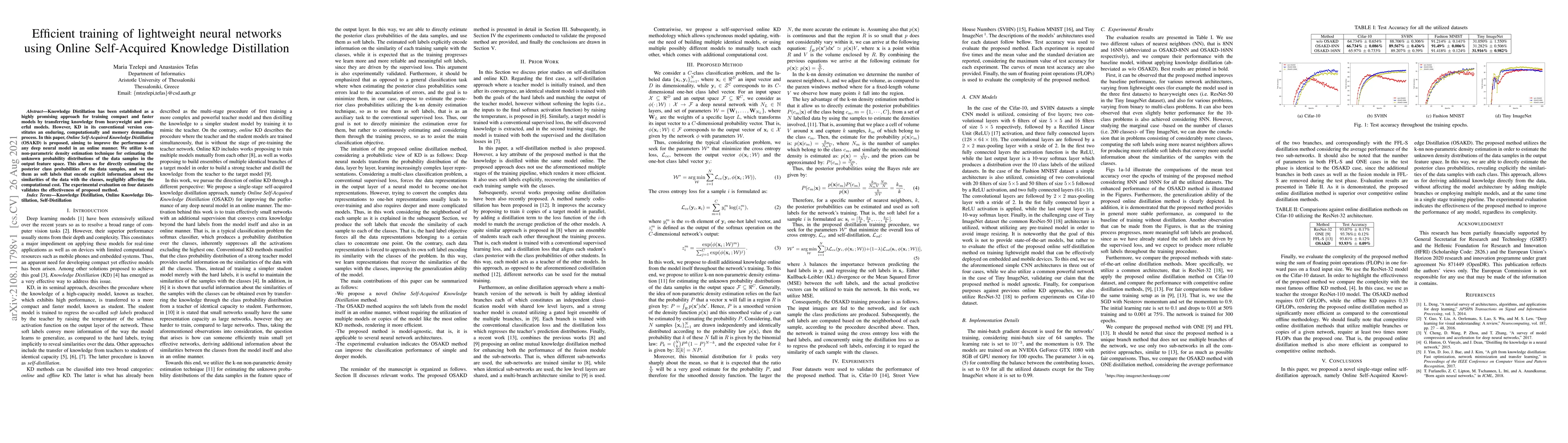 This paper proposes Online Self-Acquired Knowledge Distillation (OSAKD) to efficiently train lightweight neural networks by using k-nn density estimation for soft label generation, reducing computational costs while maintaining performance. Experimental results on four datasets demonstrate the method's effectiveness.