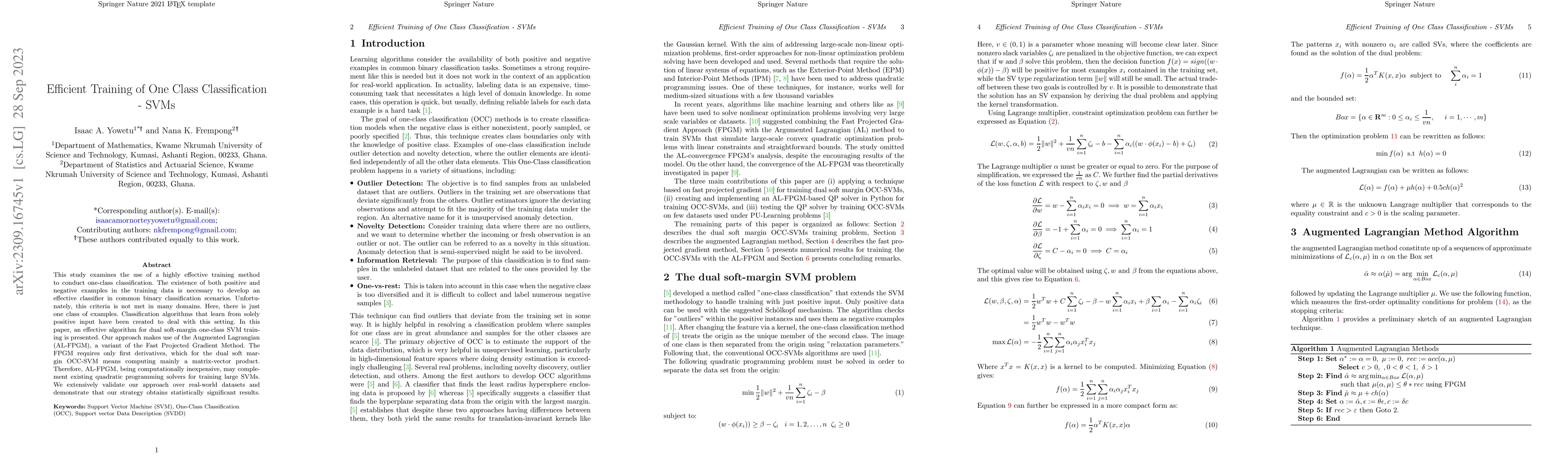 This study examines the use of a highly effective training method to conduct one-class classification. The existence of both positive and negative examples in the training data is necessary to develop an effective classifier in common binary classification scenarios. Unfortunately, this criteria is not met in many domains. Here, there is just one class of examples. Classification algorithms that learn from solely positive input have been created to deal with this setting. In this paper, an effective algorithm for dual soft-margin one-class SVM training is presented. Our approach makes use of the Augmented Lagrangian (AL-FPGM), a variant of the Fast Projected Gradient Method. The FPGM requires only first derivatives, which for the dual soft margin OCC-SVM means computing mainly a matrix-vector product. Therefore, AL-FPGM, being computationally inexpensive, may complement existing quadratic programming solvers for training large SVMs. We extensively validate our approach over real-world datasets and demonstrate that our strategy obtains statistically significant results.