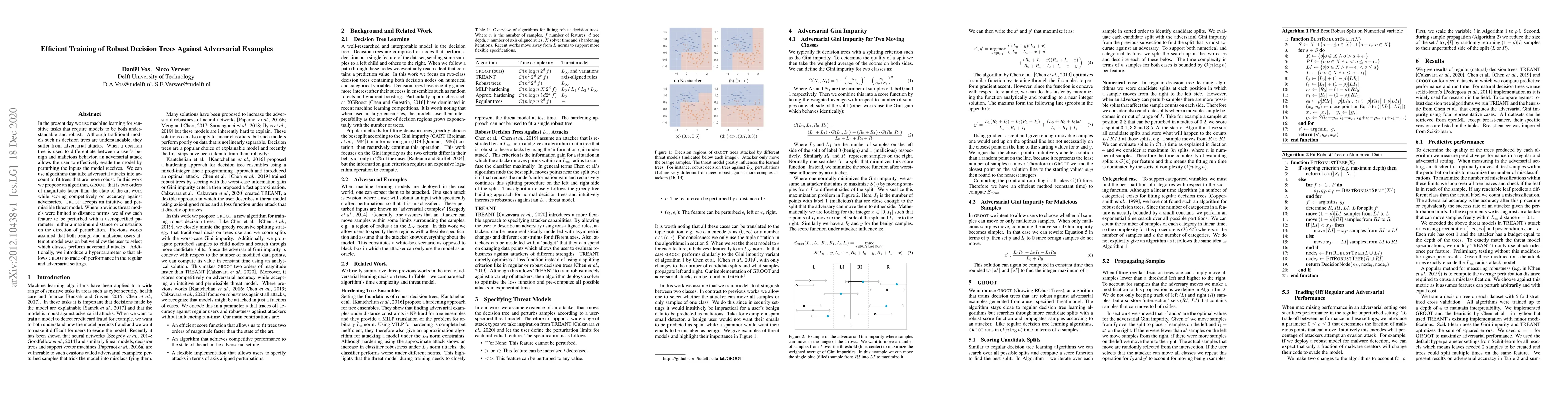 This paper presents GROOT, an efficient algorithm for training robust decision trees against adversarial examples. GROOT is two orders of magnitude faster than existing methods while maintaining competitive accuracy, allowing for customizable threat models and the ability to specify which classes perform adversarial attacks.