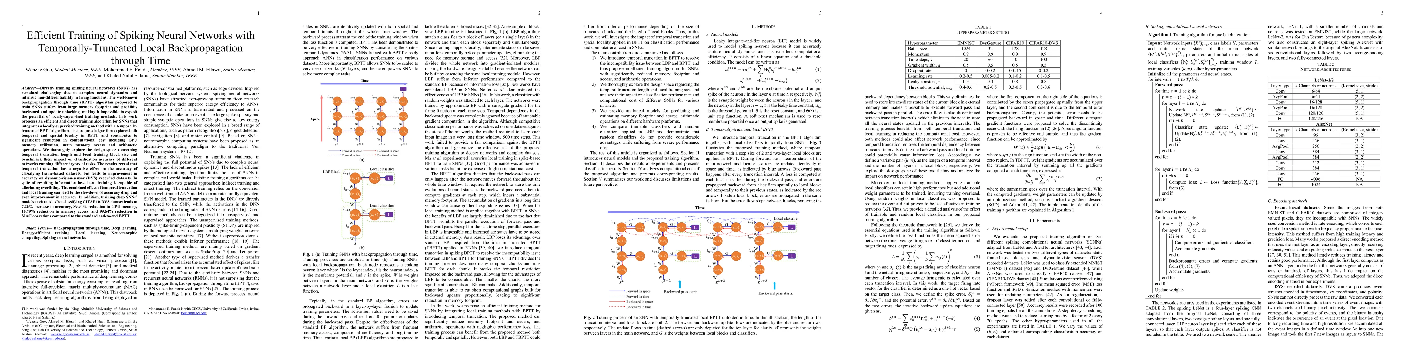 This paper proposes an efficient training algorithm for spiking neural networks (SNNs) by integrating temporally-truncated backpropagation through time (BPTT) with local training, significantly reducing computational cost and memory usage while maintaining or even improving classification accuracy. The method shows particular benefits for dynamic-vision-sensor datasets and deep SNN models.