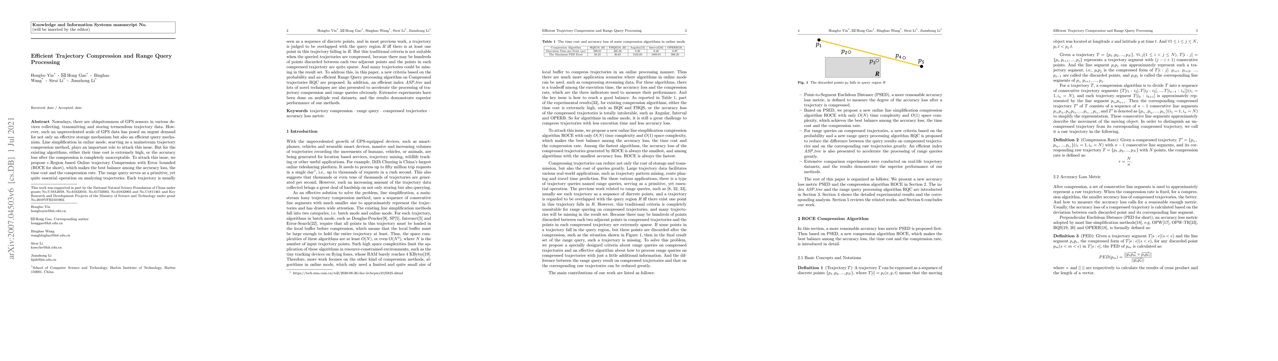 This paper proposes an efficient online trajectory compression method called ROCE and a new range query processing algorithm RQC for compressed trajectories, aiming to balance accuracy loss, time cost, and compression rate. The new criteria and ASP-tree index significantly improve the efficiency of range query processing on compressed trajectories.
