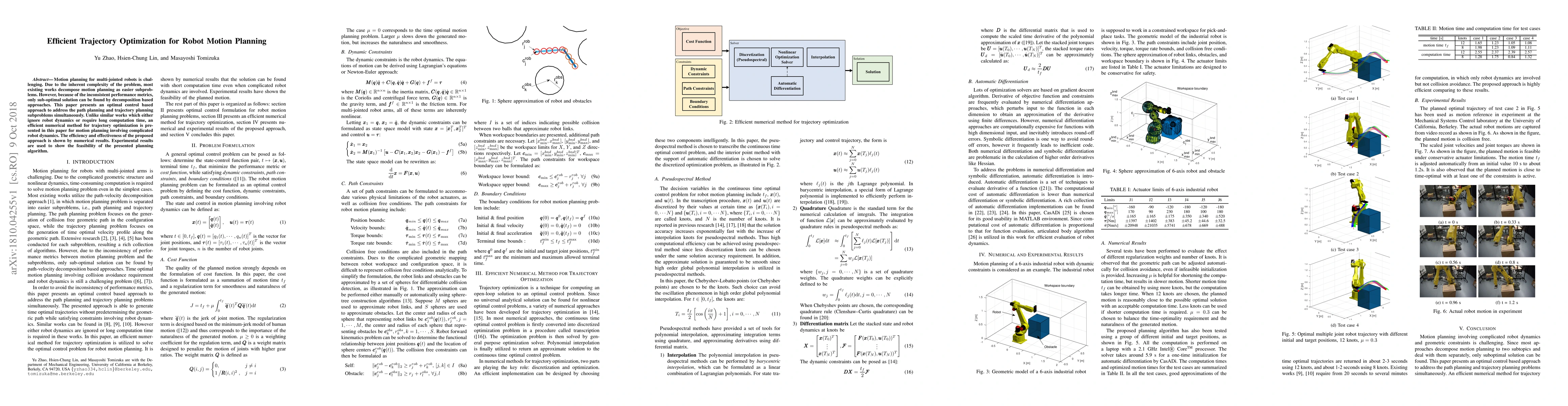 Motion planning for multi-jointed robots is challenging. Due to the inherent complexity of the problem, most existing works decompose motion planning as easier subproblems. However, because of the inconsistent performance metrics, only sub-optimal solution can be found by decomposition based approaches. This paper presents an optimal control based approach to address the path planning and trajectory planning subproblems simultaneously. Unlike similar works which either ignore robot dynamics or require long computation time, an efficient numerical method for trajectory optimization is presented in this paper for motion planning involving complicated robot dynamics. The efficiency and effectiveness of the proposed approach is shown by numerical results. Experimental results are used to show the feasibility of the presented planning algorithm.