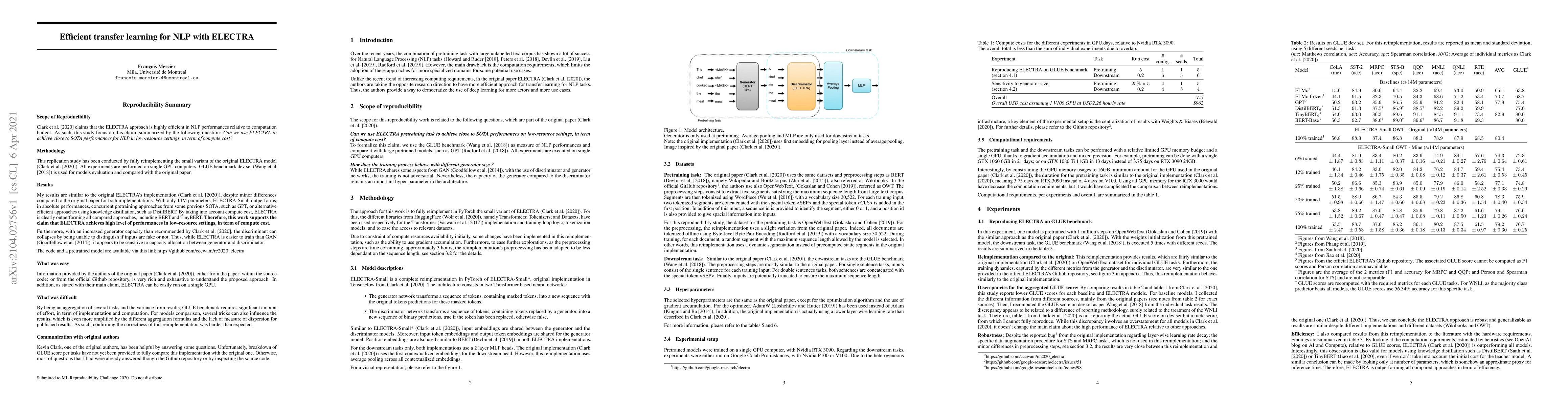 Clark et al. [2020] claims that the ELECTRA approach is highly efficient in NLP performances relative to computation budget. As such, this reproducibility study focus on this claim, summarized by the following question: Can we use ELECTRA to achieve close to SOTA performances for NLP in low-resource settings, in term of compute cost?