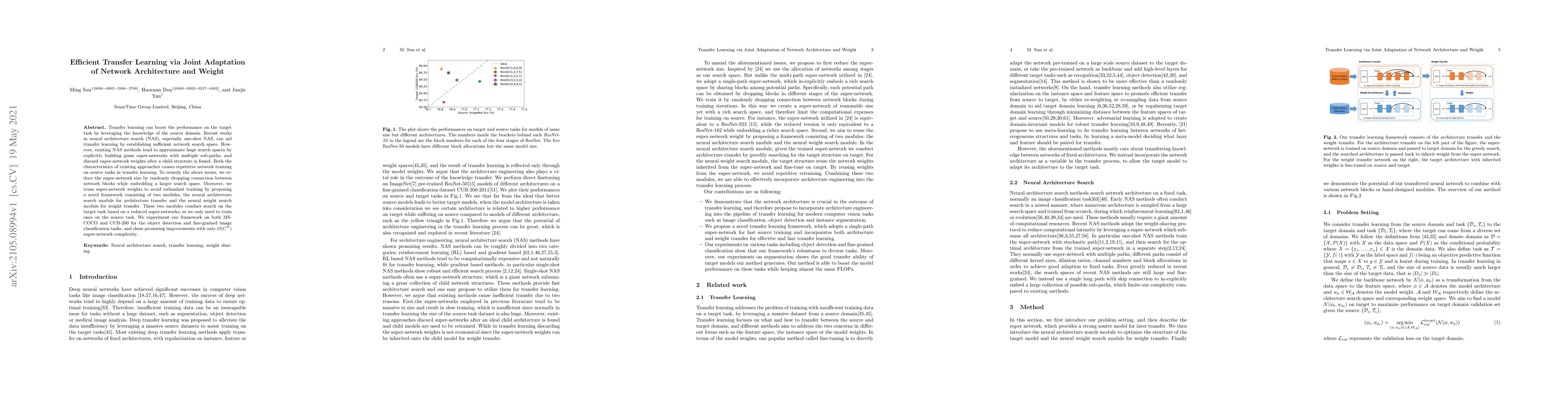 This paper proposes an efficient transfer learning framework that reduces the size of super-networks and reuses their weights to avoid redundant training on source tasks. The framework includes two modules: neural architecture search for architecture transfer and neural weight search for weight transfer, achieving improvements in object detection and fine-grained image classification with reduced complexity.