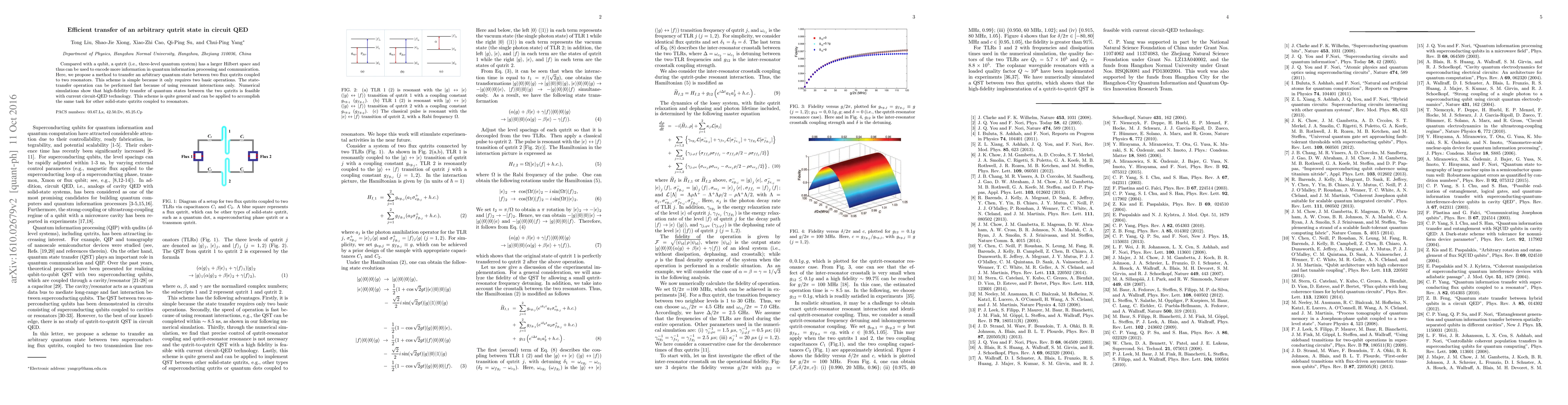 This paper proposes a simple and fast scheme for transferring arbitrary quantum states between two flux qutrits in circuit QED using resonant interactions, demonstrating high-fidelity state transfer with current technology. The method is general and applicable to other solid-state qutrits.