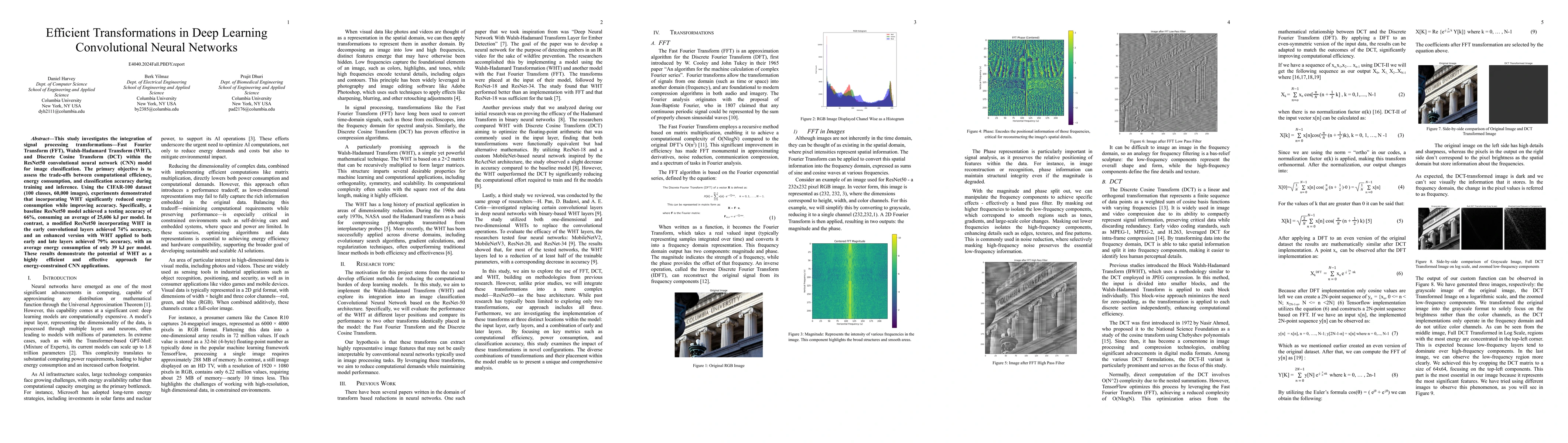 This study investigates the integration of signal processing transformations -- Fast Fourier Transform (FFT), Walsh-Hadamard Transform (WHT), and Discrete Cosine Transform (DCT) -- within the ResNet50 convolutional neural network (CNN) model for image classification. The primary objective is to assess the trade-offs between computational efficiency, energy consumption, and classification accuracy during training and inference. Using the CIFAR-100 dataset (100 classes, 60,000 images), experiments demonstrated that incorporating WHT significantly reduced energy consumption while improving accuracy. Specifically, a baseline ResNet50 model achieved a testing accuracy of 66%, consuming an average of 25,606 kJ per model. In contrast, a modified ResNet50 incorporating WHT in the early convolutional layers achieved 74% accuracy, and an enhanced version with WHT applied to both early and late layers achieved 79% accuracy, with an average energy consumption of only 39 kJ per model. These results demonstrate the potential of WHT as a highly efficient and effective approach for energy-constrained CNN applications.