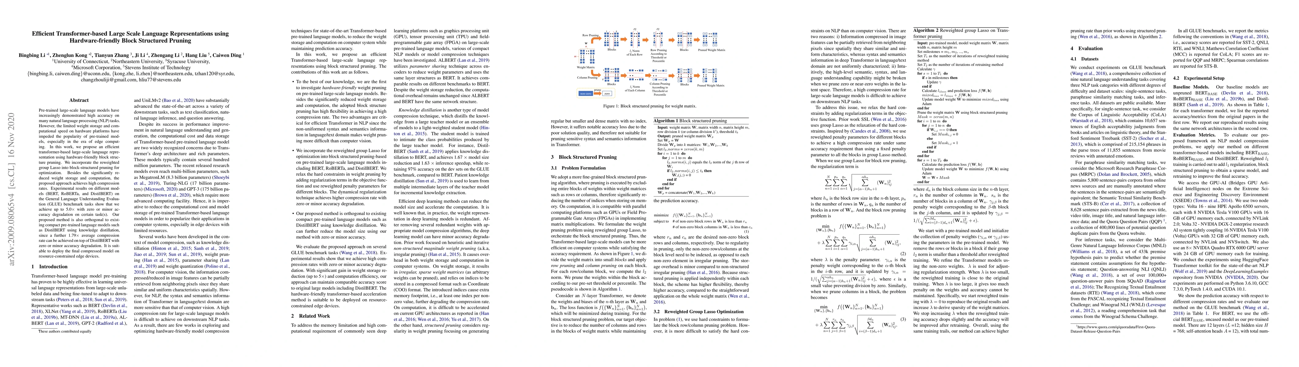 Pre-trained large-scale language models have increasingly demonstrated high accuracy on many natural language processing (NLP) tasks. However, the limited weight storage and computational speed on hardware platforms have impeded the popularity of pre-trained models, especially in the era of edge computing. In this work, we propose an efficient transformer-based large-scale language representation using hardware-friendly block structure pruning. We incorporate the reweighted group Lasso into block-structured pruning for optimization. Besides the significantly reduced weight storage and computation, the proposed approach achieves high compression rates. Experimental results on different models (BERT, RoBERTa, and DistilBERT) on the General Language Understanding Evaluation (GLUE) benchmark tasks show that we achieve up to 5.0x with zero or minor accuracy degradation on certain task(s). Our proposed method is also orthogonal to existing compact pre-trained language models such as DistilBERT using knowledge distillation, since a further 1.79x average compression rate can be achieved on top of DistilBERT with zero or minor accuracy degradation. It is suitable to deploy the final compressed model on resource-constrained edge devices.