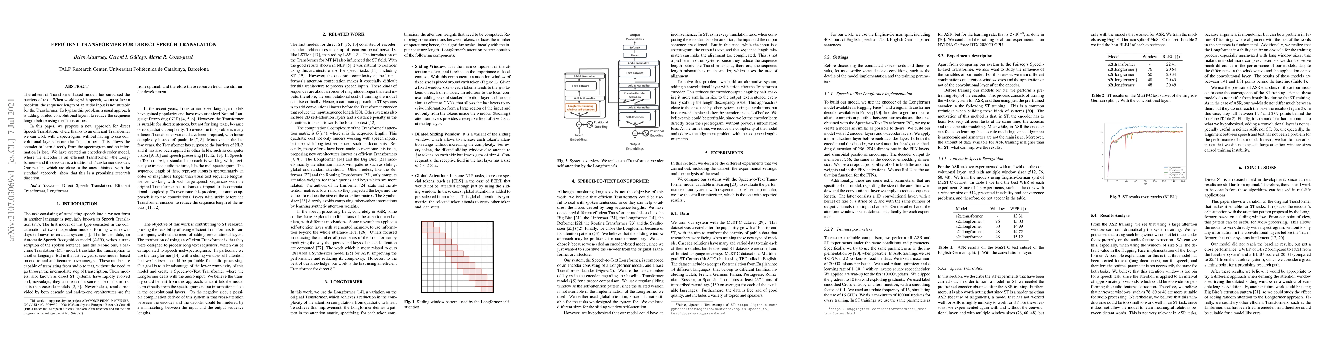 This paper proposes an efficient Transformer model, specifically the Longformer, for direct speech translation without preprocessing via convolutional layers. The approach allows the encoder to directly learn from spectrograms, preserving information, and achieves results comparable to traditional methods.