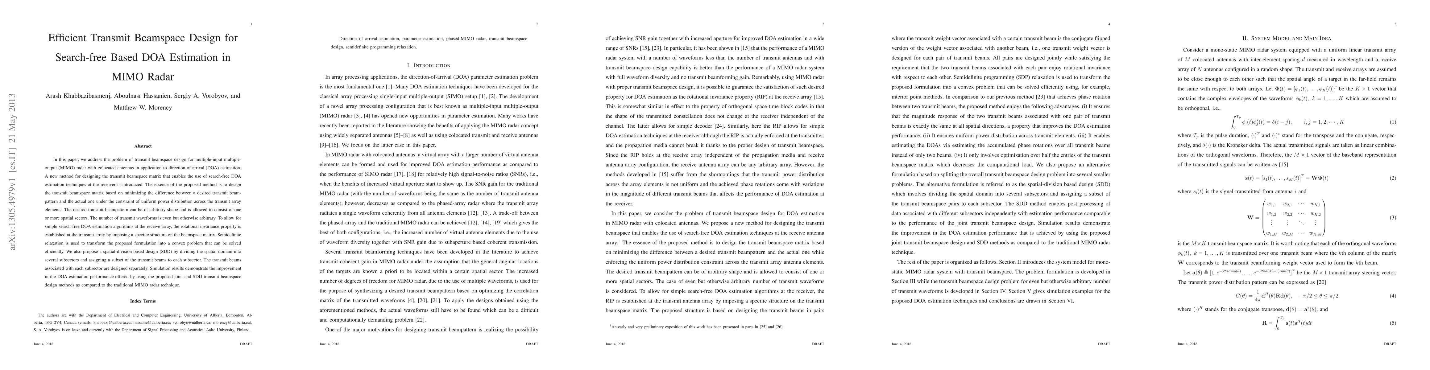 This paper proposes a novel method for designing the transmit beamspace matrix in MIMO radar for search-free direction-of-arrival (DOA) estimation. The method minimizes the difference between a desired beampattern and the actual one under uniform power constraints, allowing for arbitrary beam shapes and sectors. Simulation results show improved DOA estimation performance compared to traditional techniques.