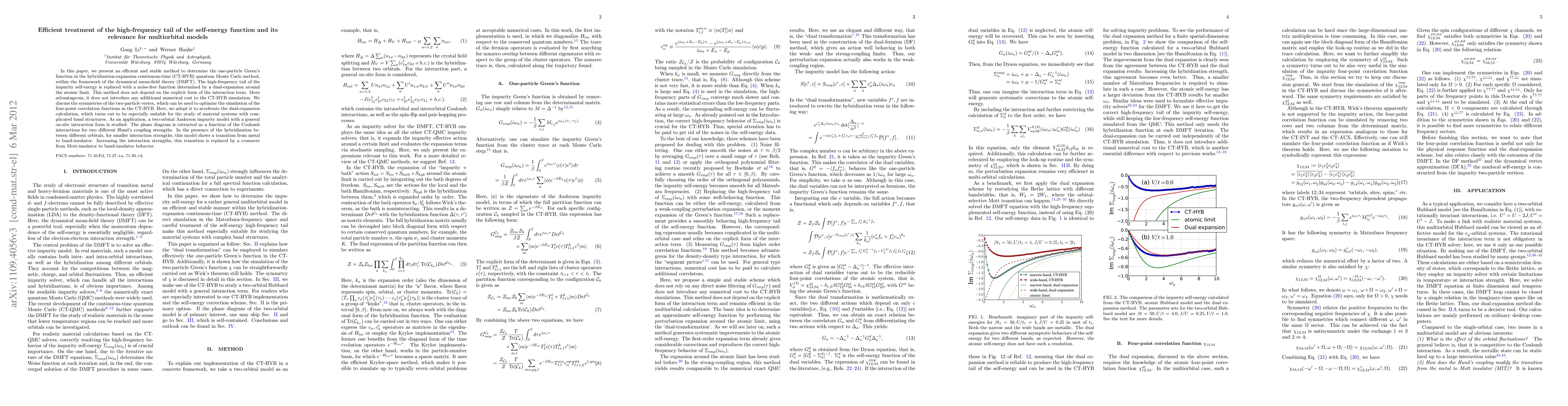 In this paper, we present an efficient and stable method to determine the one-particle Green's function in the hybridization-expansion continuous-time (CT-HYB) quantum Monte Carlo method, within the framework of the dynamical mean-field theory. The high-frequency tail of the impurity self-energy is replaced with a noise-free function determined by a dual-expansion around the atomic limit. This method does not depend on the explicit form of the interaction term. More advantageous, it does not introduce any additional numerical cost to the CT-HYB simulation. We discuss the symmetries of the two-particle vertex, which can be used to optimize the simulation of the four-point correlation functions in the CT-HYB. Here, we adopt it to accelerate the dual-expansion calculation, which turns out to be especially suitable for the study of material systems with complicated band structures. As an application, a two-orbital Anderson impurity model with a general on-site interaction form is studied. The phase diagram is extracted as a function of the Coulomb interactions for two different Hund's coupling strengths. In the presence of the hybridization between different orbitals, for smaller interaction strengths, this model shows a transition from metal to band-insulator. Increasing the interaction strengths, this transition is replaced by a crossover from Mott insulator to band-insulator behavior.