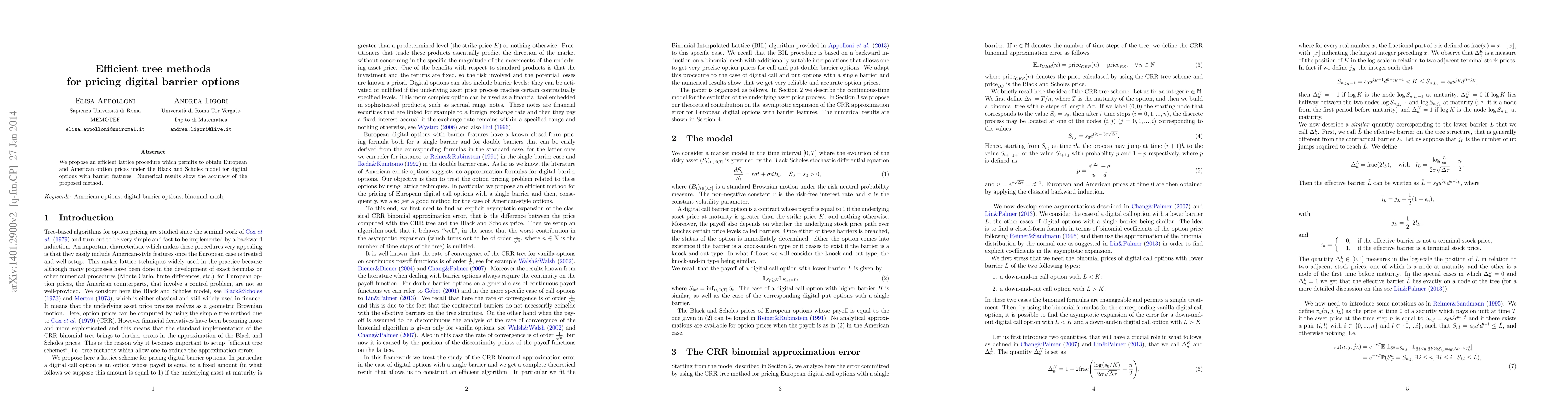The paper proposes an efficient lattice procedure for pricing digital barrier options under the Black-Scholes model, applicable to both European and American options.