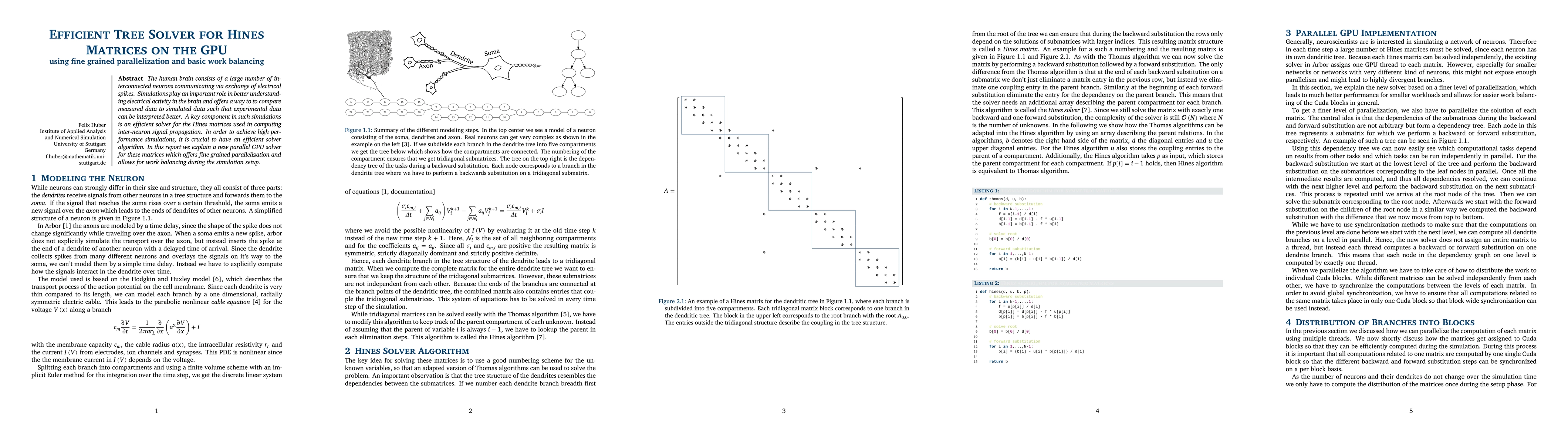 The human brain consists of a large number of interconnected neurons communicating via exchange of electrical spikes. Simulations play an important role in better understanding electrical activity in the brain and offers a way to to compare measured data to simulated data such that experimental data can be interpreted better. A key component in such simulations is an efficient solver for the Hines matrices used in computing inter-neuron signal propagation. In order to achieve high performance simulations, it is crucial to have an efficient solver algorithm. In this report we explain a new parallel GPU solver for these matrices which offers fine grained parallelization and allows for work balancing during the simulation setup.