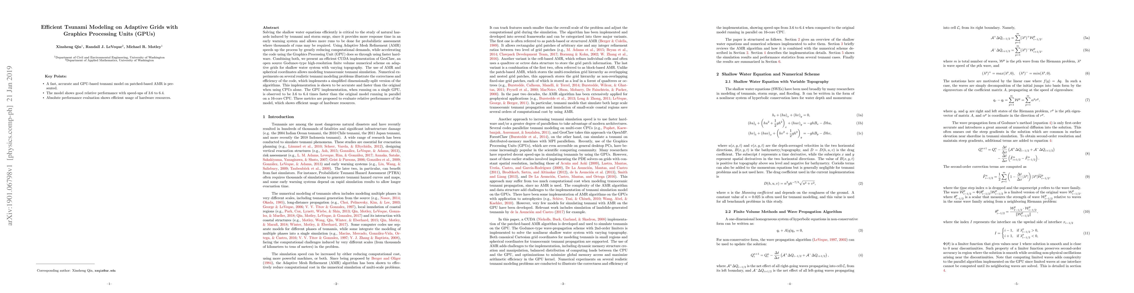 This paper presents an efficient CUDA implementation of GeoClaw for tsunami modeling on adaptive grids using GPUs, combining Adaptive Mesh Refinement to reduce computational demands and GPU acceleration for faster processing. The GPU-based model is shown to be significantly faster and more efficient than the original CPU-based version.