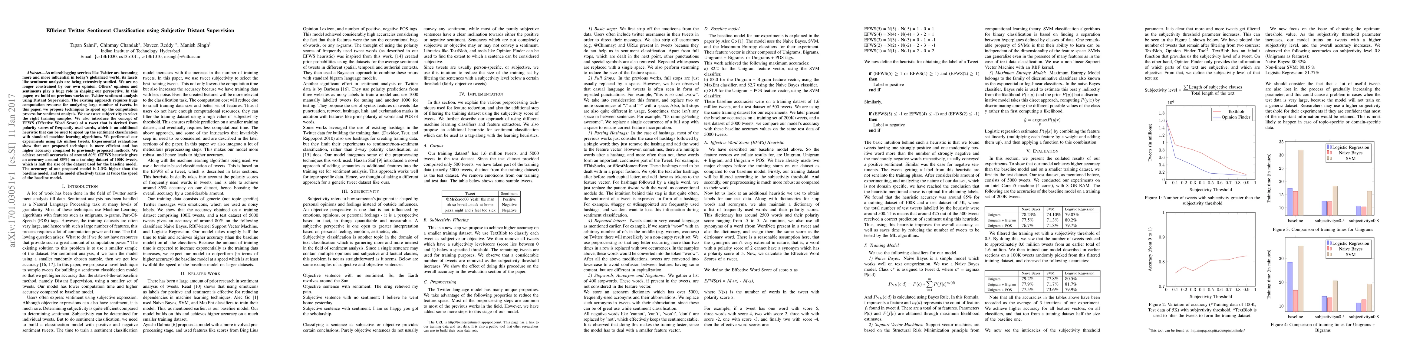 This paper proposes efficient techniques for Twitter sentiment classification using subjective distant supervision, achieving higher accuracy and faster training times by leveraging tweet subjectivity and an EFWS heuristic. Experiments on 1.6 million tweets show a 2-3% improvement in accuracy and training speed over baseline models.