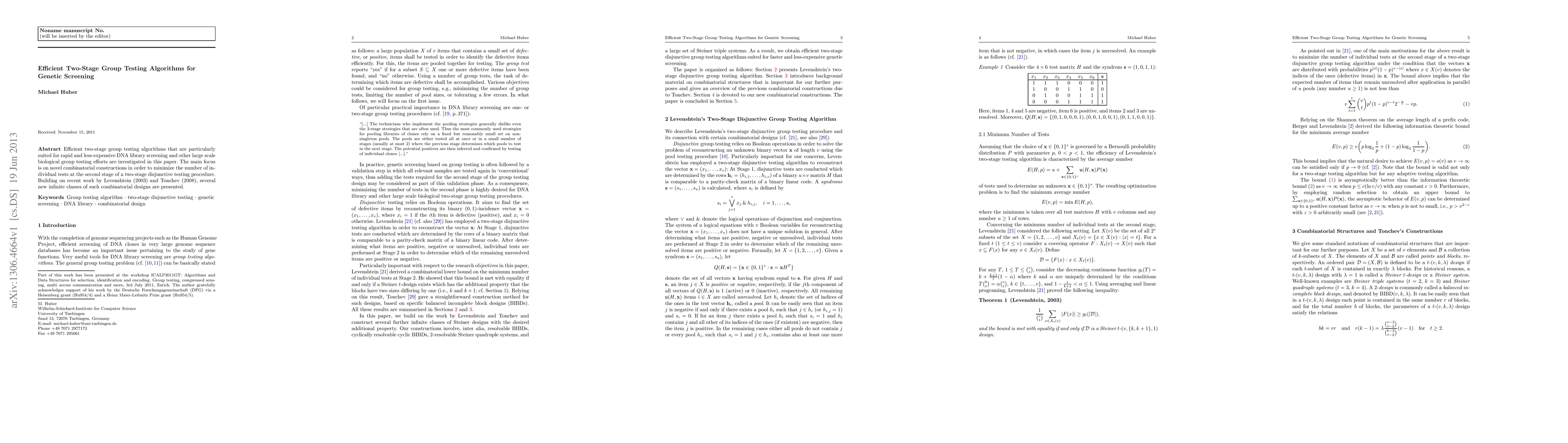 This paper investigates efficient two-stage group testing algorithms for rapid and cost-effective DNA library screening, introducing novel combinatorial constructions to minimize individual tests in the second stage. It builds on prior work by Levenshtein and Tonchev to present new infinite classes of combinatorial designs.